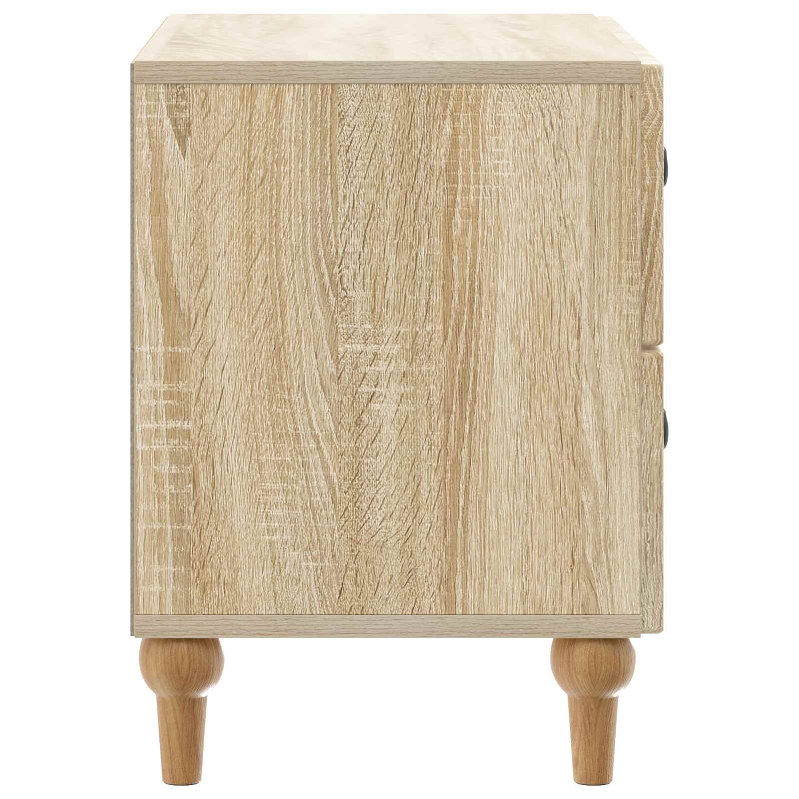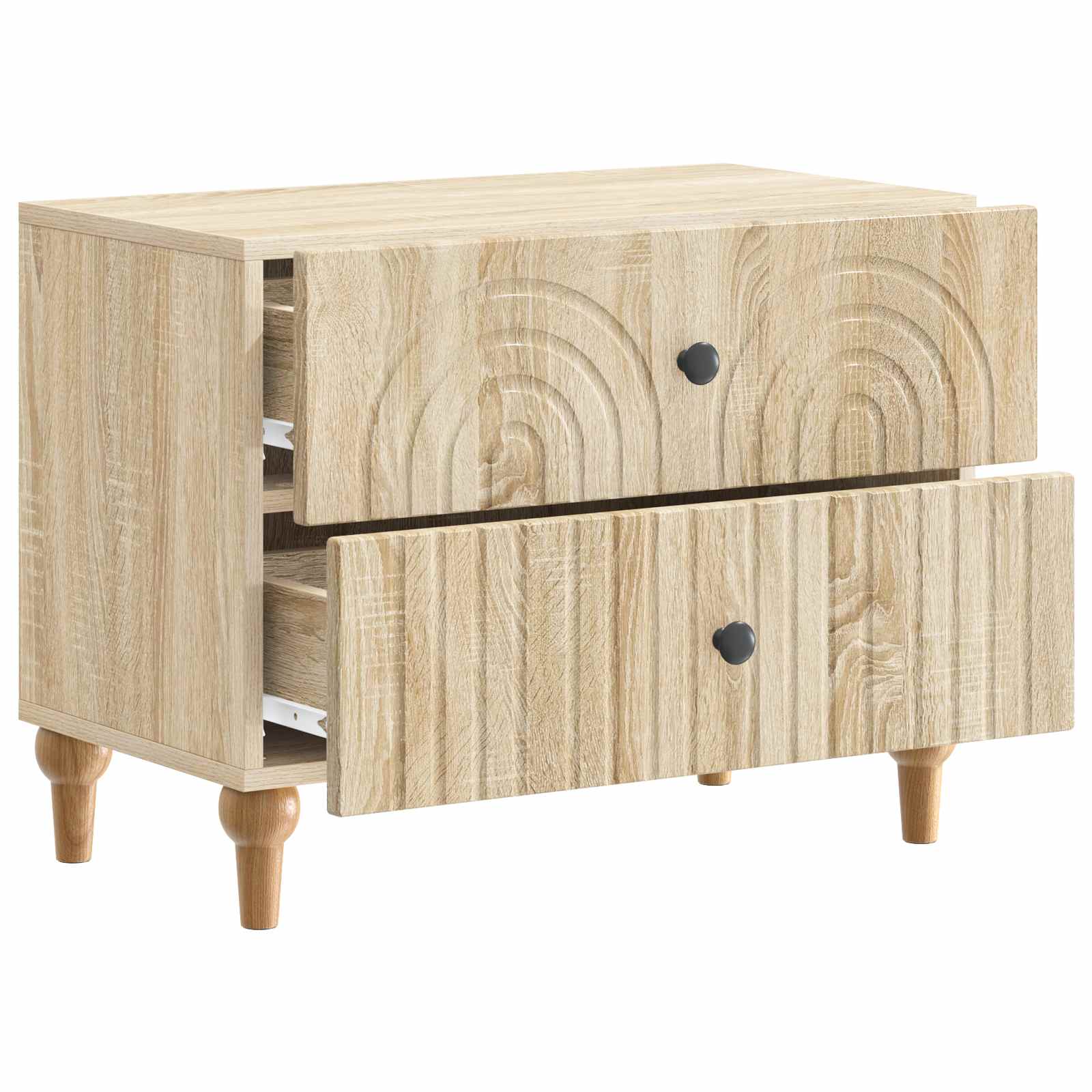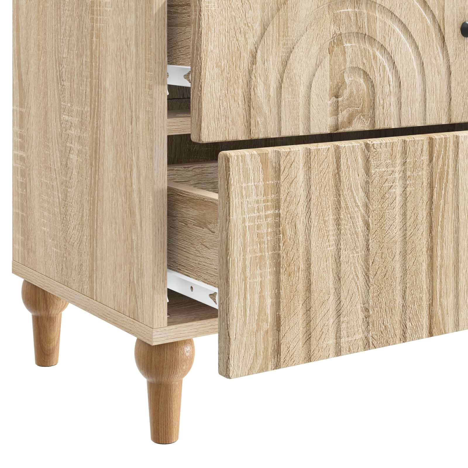 Ta elegantna nočna omarica prinaša moderni stil s svojim pravokotnim dizajnom in črtastim vzorcem. Popolnoma je zasnovana, da doda funkcionalnost in šarm v dnevno sobo ali spalnico, deluje kot odličen spremljevalec postelje, nudi rešitve za shranjevanje ter se lepo ujame z estetiko prostora. Njena minimalistična, a stilizirana oblika se brez težav prilega različnim dekorjem, zaradi česar je vsestranska za sproščene in sofisticirane prostore. Subtilna struktura iz inženirskega lesa daje občutek kakovosti in stabilnosti. Konstrukcija iz inženirskega lesa Ta omarica iz kvalitetnega inženirskega lesa nudi trdnost in privlačen izgled. Izbira materiala zagotavlja, da ostane trda in odporna na vsakodnevno obrabo, kar pomeni zanesljivo službo še dolga leta. Obilne možnosti shranjevanja Zasnovana s predali in elegantnimi gumbi, omarica nudi prostoren prostor za osebne stvari in dodatne potrebščine. Ta dizajn spodbuja organiziranost, kar jo naredi praktičen dodatek k vsakemu domu. Sofisticiran moderen stil Moderna, preprosta zasnova z unikatno črtasto obrobo zagotavlja, da se nočna omarica brez težav prilagaja prostorom z minimalistično estetiko. Zasnovana za uporabnost Ta omarica izboljšuje funkcionalnost prostora. Njena kompaktna velikost omogoča, da se prilega ob posteljo, hkrati pa nudi dovolj površine za svetilke in budilke. Enostavno vzdrževanje Da bi ohranili videz kot nov, preprosto obrišite z vlažno krpo, kar omogoča brezskrbno nego za zaposlene lastnike domov.