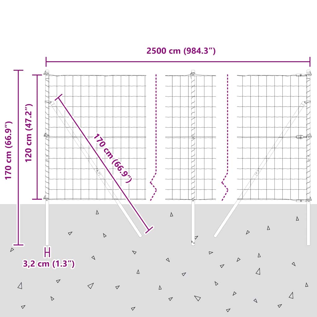 - Splošne dimenzije: 2500 x 3,2 x 120 cm (D x Š x V)