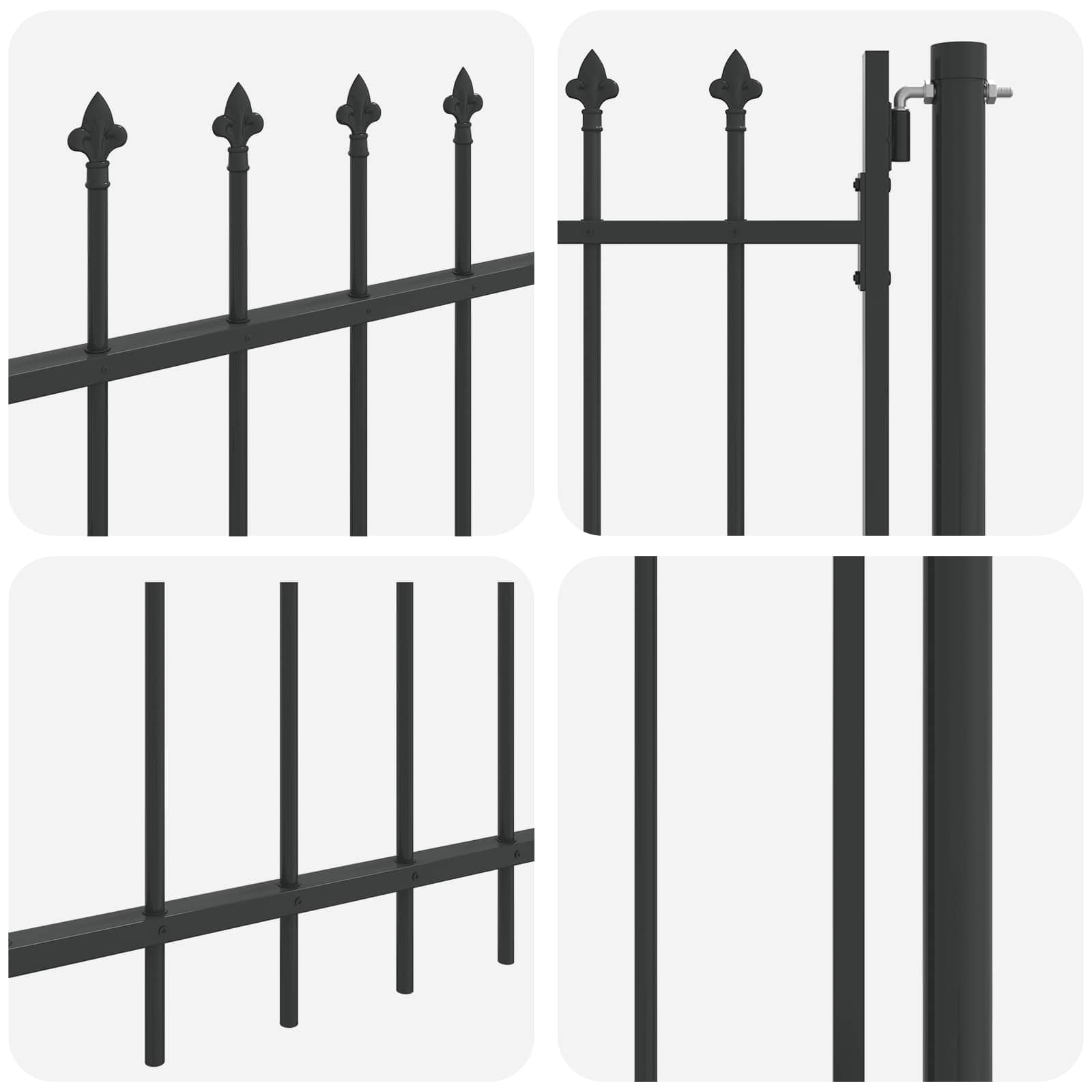 Ta vrata za ograje so praktična in trdna rešitev za zaščito vašega vrta ali terase, pa še izgledajo dobro. Izdelana so iz zanesljivega prašno lakiranega jekla, kar povezuje moderen dizajn z močno funkcionalnostjo, tako da lastnikom domov omogoča, da vse skupaj združijo v svojem zunanjem prostoru. Prašno lakirano jeklo: Vrata so narejena iz trpežnega prašno lakiranega jekla, ki se dobro upira obrabi in vremenskim vplivom. Idealna so za zunanjo uporabo in zagotavljajo dolgo življenjsko dobo. Robustna konstrukcija: Vrata so zasnovana tako, da držijo težje stvari in nudijo močno zaščito za vašo lastnino. Njihova kakovostna gradnja daje lastnikom mir, ker so zelo zanesljiva ovira pred tujci. Združljivost s ključavnicami: Povečajte varnost z uporabo ključavnic, ki ustrezajo vašim potrebam. Ta funkcija vam omogoča, da prilagodite varnostne rešitve glede na potrebe, kar prinaša dodatno zaščito pred nepooblaščenim dostopom. Soden dizajn: Z čistimi linijami in minimalnim okrasjem ta moderna vrata odlično dopolnijo vsako zunanjost. Njihov privlačen videz izboljša izgled vašega vrta ali terase, obenem pa funkcionalno zagotavljajo zanesljivo oviro. Enostavno vzdrževanje: Vrata lahko enostavno očistite z vlažno krpo, da ostanejo lepa in urejena. Ta minimum vzdrževanja zagotavlja, da bodo vrta dolgo ohranila svoj funkcionalni in estetski izgled.