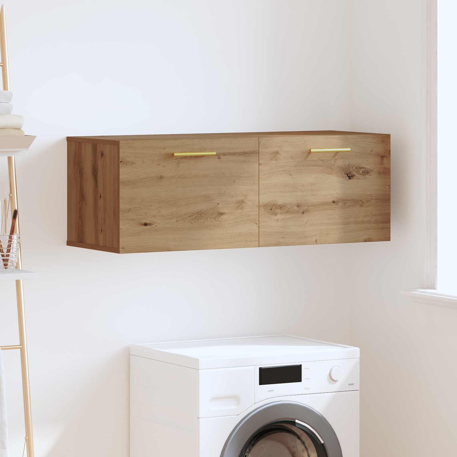 Ta stenska omara iz inženirskega lesa je super izbira za vsakogar, ki želi svoj prostor oblikovati s stilom. Pravokotna zasnova se super obnese v dnevnih sobah, spalnicah in hodnikih. Z rustikalnim stilom prinaša naraven čar in se lepo ujame s skoraj vsakim slogom notranje opreme. S svojo pametno zasnovo prihrani prostor na tleh in hkrati doda malo elegance, kombinira praktičnost in odličen videz. Gradnja iz inženirskega lesa: Ta omara je trdna in zanesljiva. Izbira inženirskega lesa zagotavlja dolgo življenjsko dobo, groba tekstura pa je prijetna na otip in izgleda res fantastično. Združuje funkcionalnost in stil. Stenska zasnova: Enostavno jo obesimo na steno, kar pametno izkorišča vertikalni prostor in osvobodi tla. Idealna je za manjše prostore ali kjerkoli potrebujete pametno rešitev. Omogoča tudi enostavno čiščenje pod njo. Vrata s tečaji: Močna vrata s tečaji se enostavno odprejo, kar omogoča hiter dostop do vaših stvari. Ohranijo vse lepo urejeno ter nudijo čisto in organizirano podobo v vsakem prostoru. D-ročaji: Zlahka prijemljive D-ročaje je pravi užitek uporabljati. Zlate ročaje dodajo eleganco in zagotavljajo odličen oprijem. Enostavno vzdrževanje: Sestavljanje omare je enostavno – potrebujete le izvijač in vrtalnik. Tako lahko kmalu uživate v svoji novi shranjevalni rešitvi brez skrbi.