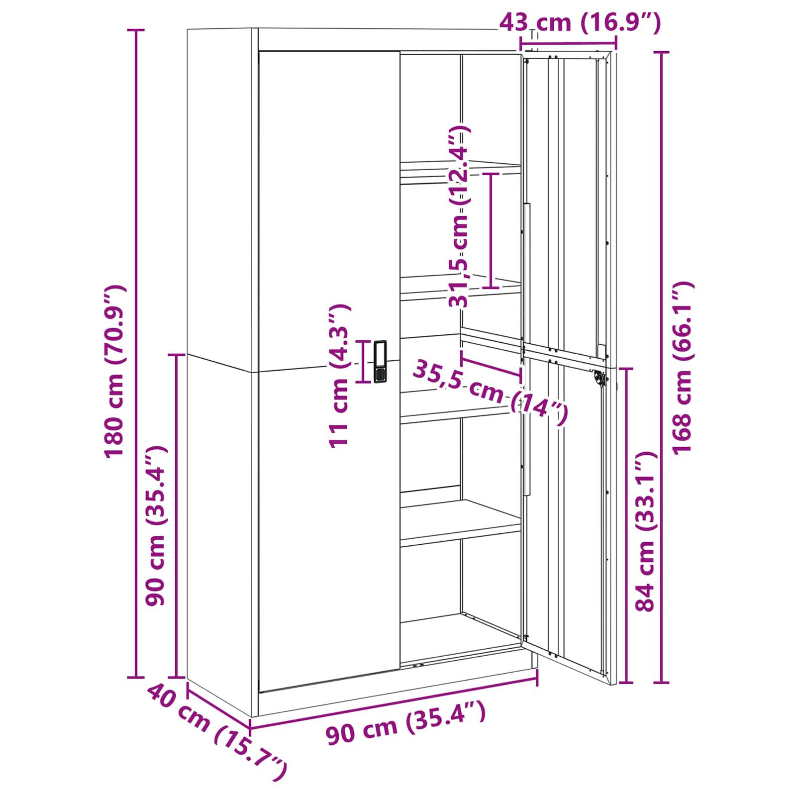 - Splošne dimenzije: 90 x 40 x 180 cm (D x Š x V)
