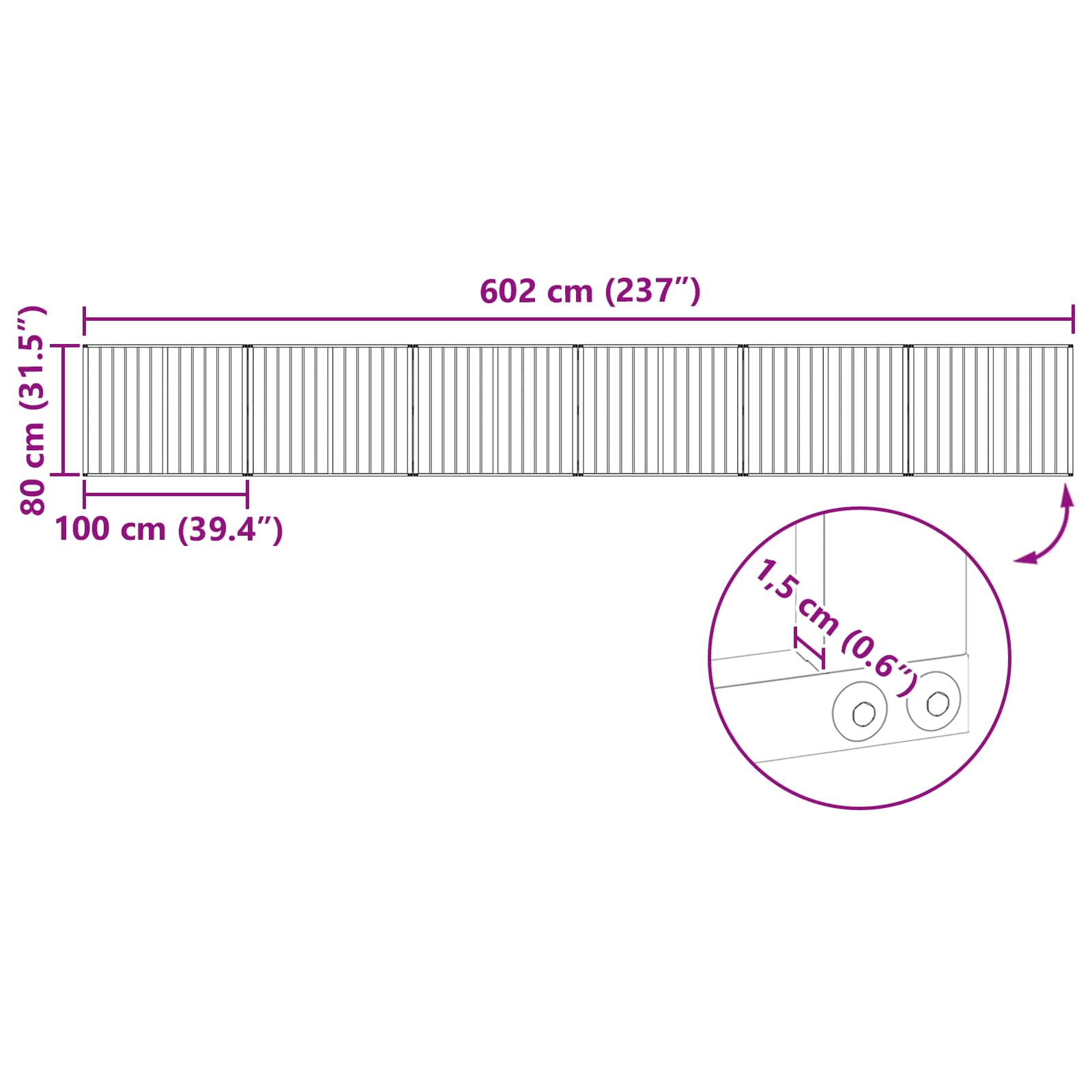 - Splošne dimenzije: 602 x 1,5 x 80 cm (D x Š x V)