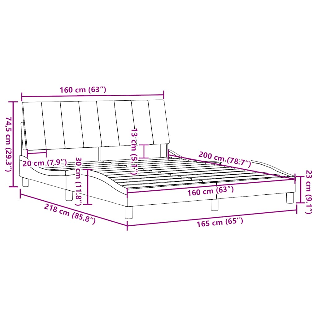 Za boljši in mirnejši spanec s tem posteljnim okvirjem! Predstavlja prijeten dodatek vsaki spalnici. Mehak in trpežen material: Poliestrska tkanina ponuja kombinacijo mehkobe, zračnosti in vzdržljivosti, kar zagotavlja vrhunsko udobje in prijetnost.Letve za optimalno oporo: Ta posteljni okvir je opremljen z letvicami, ki nudijo bistveno oporo in zračnost vaši vzmetnici.Vsestransko vzglavje: Ta posteljni okvir je opremljen z vzglavjem, ki zagotavlja odlično oporo za hrbet, ko sedite v postelji in berete ali gledate televizijo, hkrati pa služi tudi kot dekorativni element.Priročna oblika: Blazinjeno vzglavje ima zadrgo za enostavno namestitev, s sprijemalkami na hrbtni strani pa lahko pritrdite LED luči.Valovita stranska oblika: Valovit videz posteljnega okvirja je eleganten in prefinjen ter doda sodoben in eleganten pridih vaši opremi ter jo spremeni v osrednjo točko vaše spalnice. Dobro je vedeti:Vzmetnica ni priložena postelja. Ponujamo raznoliko izbiro vzmetnic. Za ustrezno vzmetnico si lahko ogledate našo trgovino.Ta posteljni okvir ima letvičasto dno in vključuje letvice.