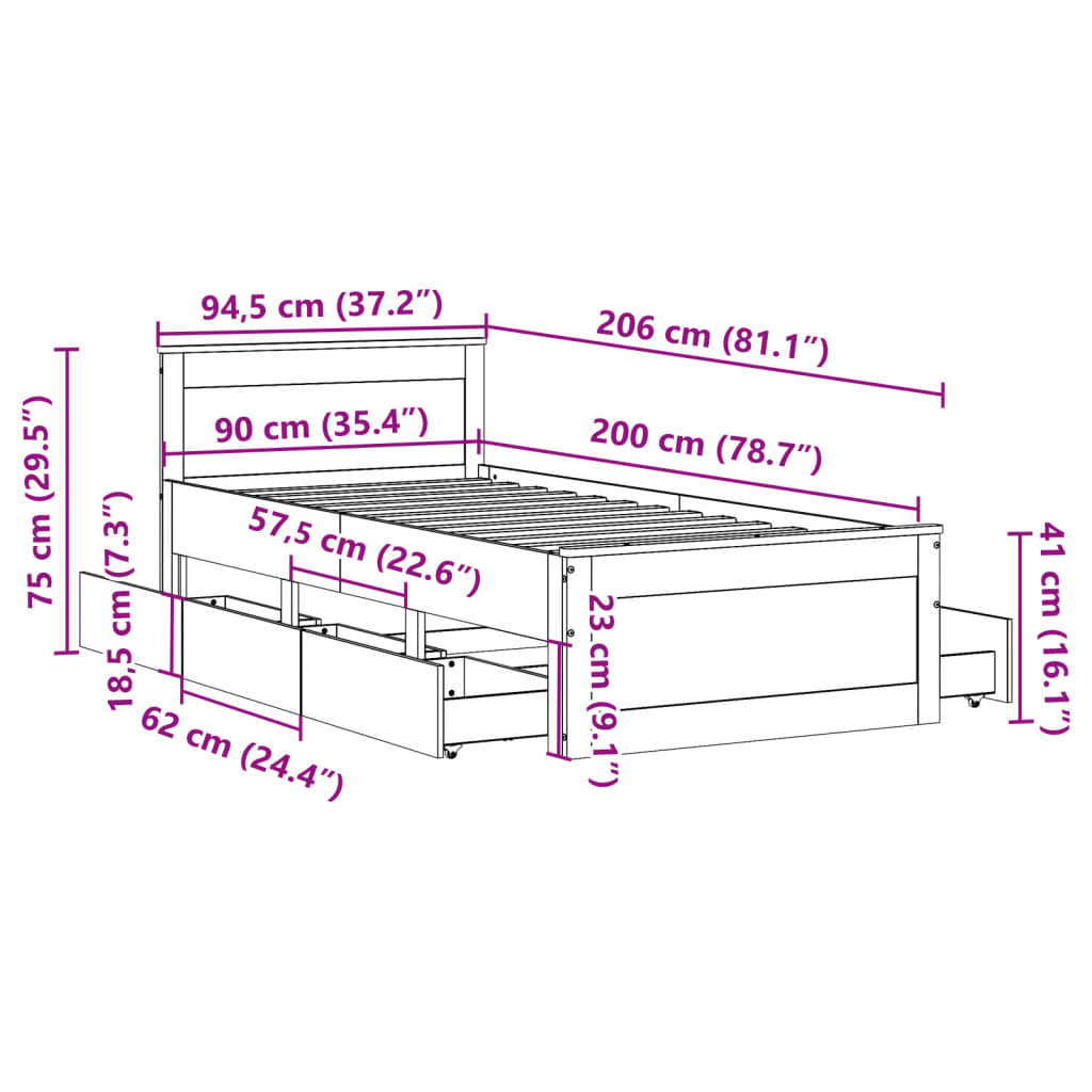 Zagotovite si boljši in mirnejši spanec s tem posteljnim okvirjem! Predstavlja prijeten dodatek vsaki spalnici. Stabilen in dolgotrajen okvir: Masivni borov les je znan po svoji trdnosti in vzdržljivosti. Njegovi ravni vzorci in značilne grče prispevajo k njegovemu rustikalnemu šarmu.Letovito dno za optimalno oporo: Posteljni okvir je opremljen z letvicami za oporo in zračnost vaše vzmetnice.Stabilne in trpežne noge: To posteljo podpirajo trdne noge, ki zagotavljajo stabilnost, varnost in trdnost.Funkcionalno vzglavje: Vzglavje lesene postelje lahko ohrani vašo vzmetnico na mestu. Vzglavje vam nudi tudi odlično oporo za hrbet, ko sedite v postelji in berete ali gledate televizijo.Funkcija shranjevanja: Ta posteljni okvir ponuja predale za organizirano shranjevanje revij, knjig, igrač in drugih majhnih predmetov. Dobro je vedeti:Vzmetnica ni priložena tej postelji. Ponujamo pa raznoliko izbiro vzmetnic. Za ustrezno vzmetnico si lahko ogledate našo trgovino.Ta posteljni okvir ima letvičasto dno in vključuje letvice.