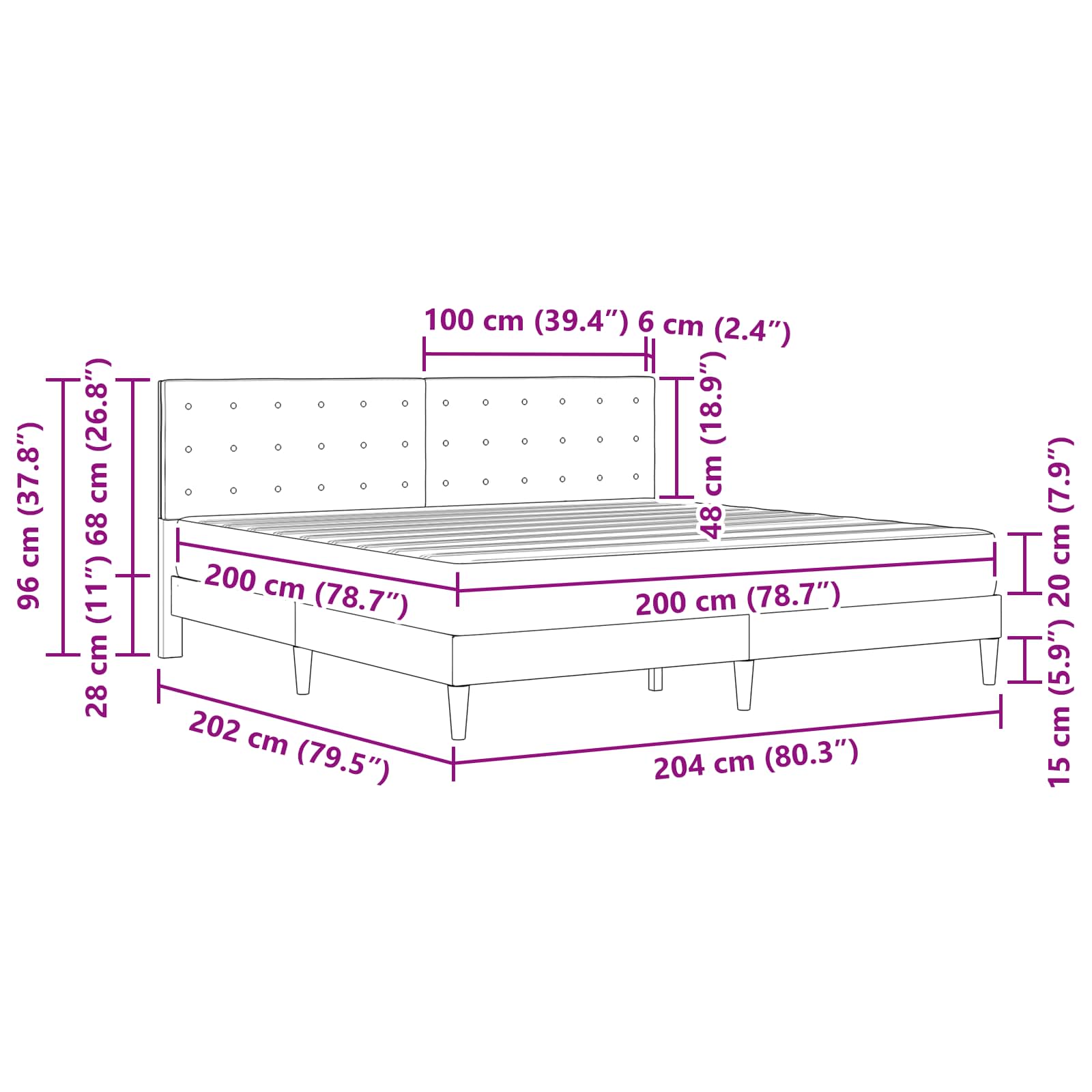 - 1 x Postelja z vzglavjem: 202 x 204 x 96 cm (D x Š x V)