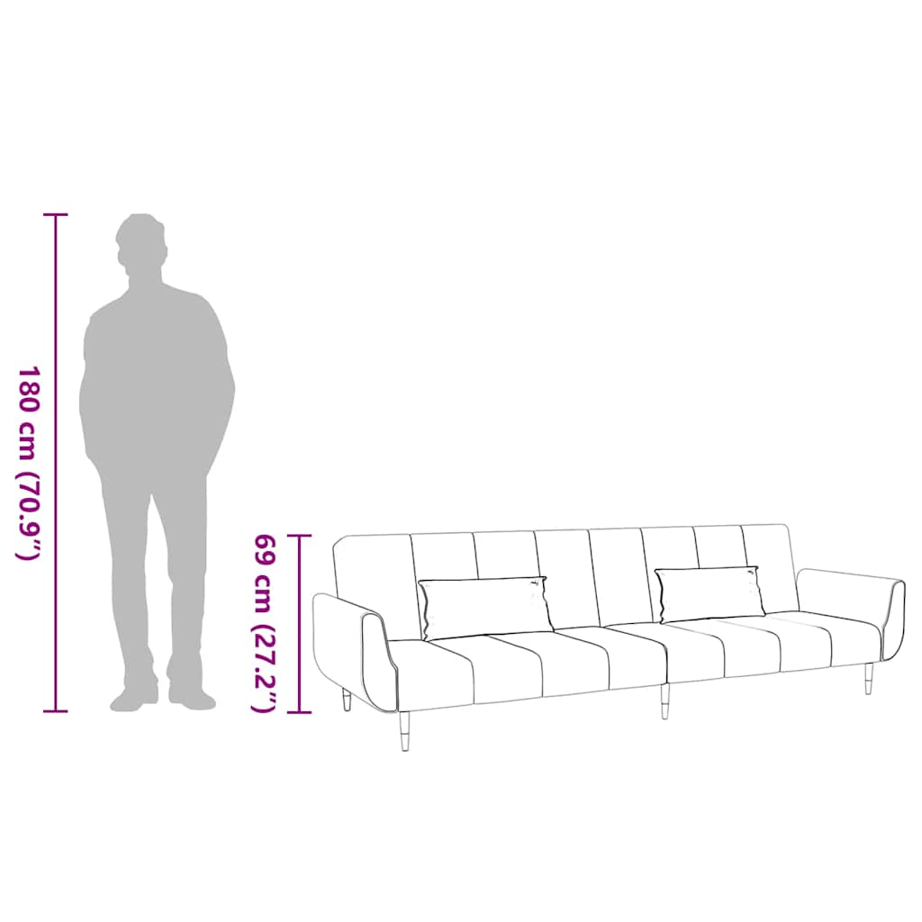 Ta raztegljiv kavč je zasnovan tako, da se raztegne. Tako lahko izbirate med sedenjem, ležanjem ali spanjem glede na svoje želje in udobje. To je idealen kos pohištva, če potrebujete dodaten prostor za spanje za svoje prijatelje in goste. Mehak in udoben material: Žametno blago z delikatno teksturo je mehko in udobno na dotik.Nastavljivo naslonjalo za hrbet: Dve ločeni naslonjali lahko potisnete delno ali v celoti navzdol, da ustvarite idealno mesto za spanje ali zakonsko posteljo.Moč in stabilnost: Lesen okvir in kovinske noge kavča zagotavljajo trdnost in stabilnost.Dve blazini za udobje : Priloženi sta dve blazini za vaše udobje. Največ 110 kg na sedež. Zavedajte se nevarnosti odprtega ognja in drugih virov močne vročine v bližini izdelka.