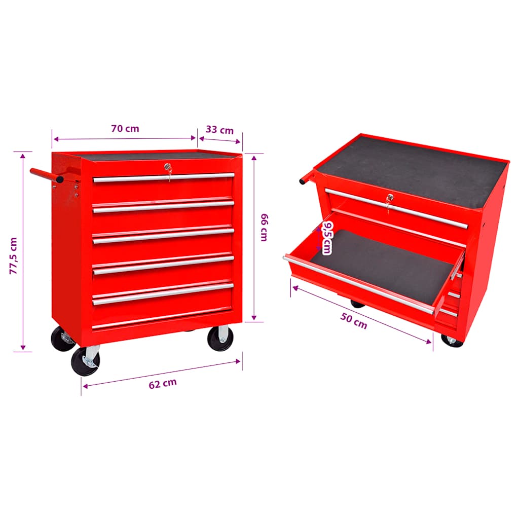 Uporabite ta priročni voziček za shranjevanje orodja s 5 drsnimi predali za shranjevanje in organiziranje vašega orodja. Vsak predal ima nedrsečo oblogo na dnu, da drži vaše orodje na mestu. Zaradi vgrajene ključavnice se lahko vsi predali zaklenejo na enkrat, kar jim preprečuje odpiranje po nesreči, ko voziček premikate. Dva izmed vrtljivih kolesih imata zavore. Robusten pult na vozičku za orodje bo odlično mesto, da boste imeli pogosto uporabljeno orodje na dosegu roke. Voziček ima tudi priročen stranski ročaj za potiskanje vozička.