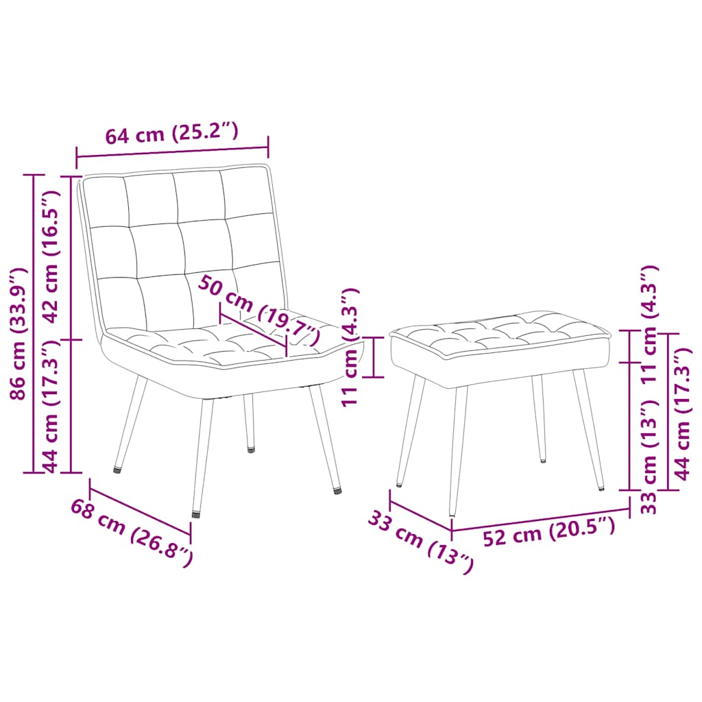 Doživite optimalno udobje po napornem dnevu na tem udobnem, sproščujočem stolu s podnožnikom! Mehak in prijeten: Žamet je mehka in udobna tkanina, ki je prijetna do kože.Robusten in stabilen okvir: Kovinski okvir in okvir iz vezanega lesa zagotavljata vzdržljivost in stabilnost.Udobno sedenje: Mehko oblazinjenje sedeža nudi popolno udobje in oporo ter zagotavlja prijetno sedenje.Udobno naslonjalo: Naslonjalo nudi dodatno oporo in udobje.Vsestranska uporaba: Ta žametni stol je vsestranski in eleganten dodatek za vsak dom ali pisarno za prosti čas. Ne glede na to, ali ga postavite blizu sedežne garniture v dnevni sobi ali ustvarite prijeten kotiček v svoji spalnici ali delovni sobi, bo izboljšal estetiko vašega bivalnega prostora. Dobro je vedeti:Vsakemu izdelku je priložen priročnik za enostavno sestavljanje.
