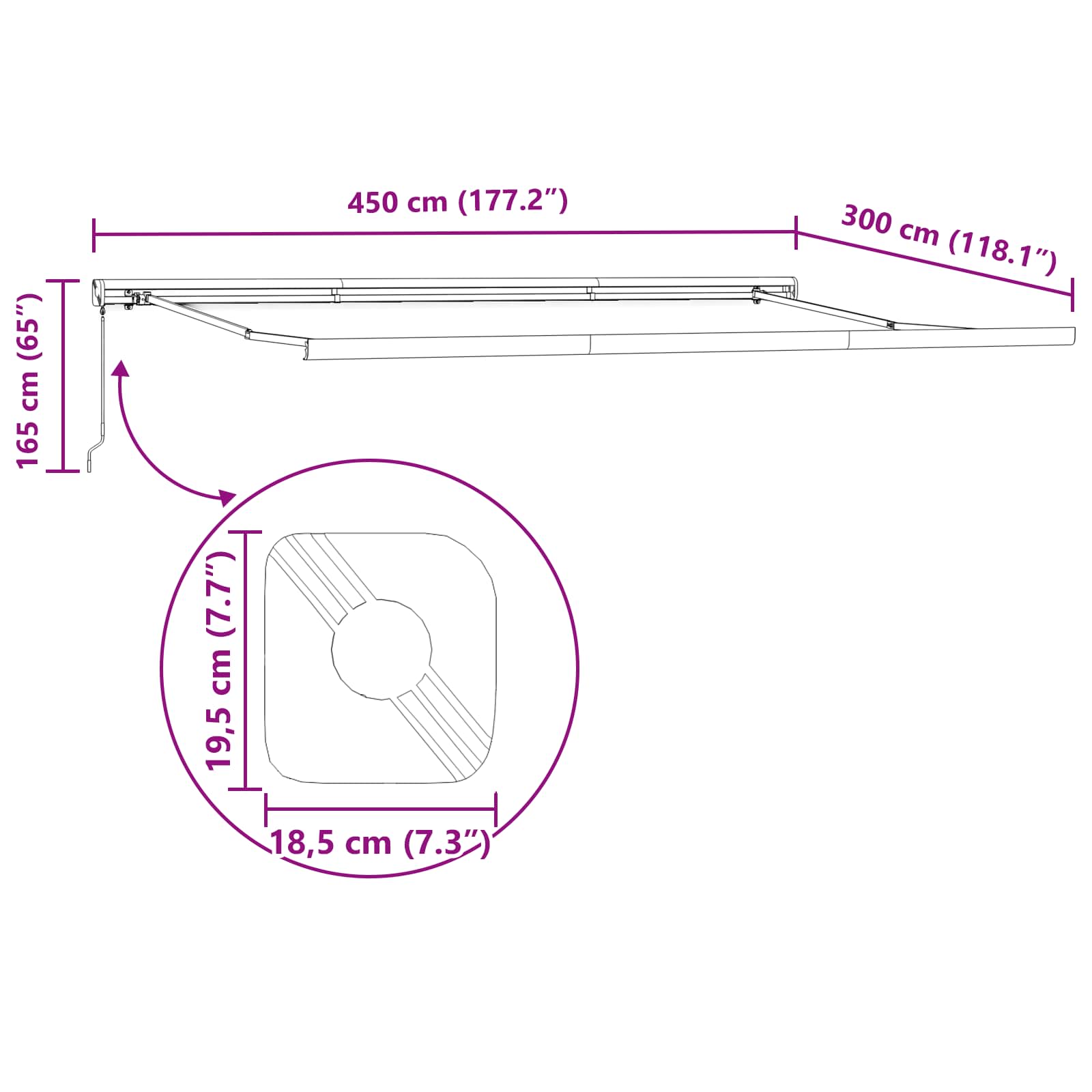 Ta retraktivna tenda združuje preprostost in funkcionalnost v modernem dizajnu. Super rešitev za senco na vašem vrtu ali terasi, zaradi retraktivne zasnove nudi vsestransko pokritost. Predstavljajte si urejena druženja, zaščitena pred močnimi žarki sonca in nenadnim dežjem, kjer se udobje in narava spajata v brezskrbno strukturo. Moderen stil: Ta elegantna retraktivna tenda se zliva z vsakim zunanjim dekorjem. Zasnova je enostavna in minimalna, kar poskrbi za privlačen izgled vašega prostora. Super za vse, ki cenijo čiste linije in enostavno eleganco. Materialne lastnosti: Izdelana iz 100% poliestra, tenda je zelo trpežna in odporna na UV žarke ter vodo. To ni le zaščita pred slabim vremenom, ampak tudi odlična naložba. Kakovosten kovinski okvir nudi stabilnost in preprečuje, da bi tkanina izgubila svoj gladek videz. Komponente: Retraktivni mehanizem omogoča hitro preklapljanje med raztegnjenimi in zaprtimi pozicijami, kar prinaša senco ali odprt prostor, kot ga potrebujete. Zasnova je zanesljiva in enostavna za uporabo, kar jo dela idealno izbiro za dinamične prostore. Navodila za nego: Ščitite svojo tendo tako, da jo pokrijete, ko je ne uporabljate. To pomaga ohranjati funkcionalnost ter zunanji izgled, tako da bo videti privlačno še dolga leta. Zahteve za sestavljanje: Dobavljena kot ena enota, za sestavljanje potrebujeta dve osebi in osnovna orodja, kot so vrtalnik, izvijač in ključ. Postopek je enostaven, kar omogoča hitro namestitev, da takoj uživate v novem kosu po montaži. Nevarnost! Močna vzmet, ko se odpre. NE odstranjujte te vrvi, dokler ne opravite vseh korakov montaže, pri čemer so vsi vijaki pritrjeni, predmet pa je pritrjen na steno! Opozorilo! Bodite pozorni pri popuščanju ročic, saj so pod napetostjo! Nenadna sprostitev ročice zložljive tende lahko povzroči telesno poškodbo. Opozorilo: Pred uporabo izdelka morate prebrati navodila za uporabo. Opozorilo: Uporaba ob zmrzali lahko poškoduje izdelek. Zunanja uporaba pri gradnji in gradbenih delih.