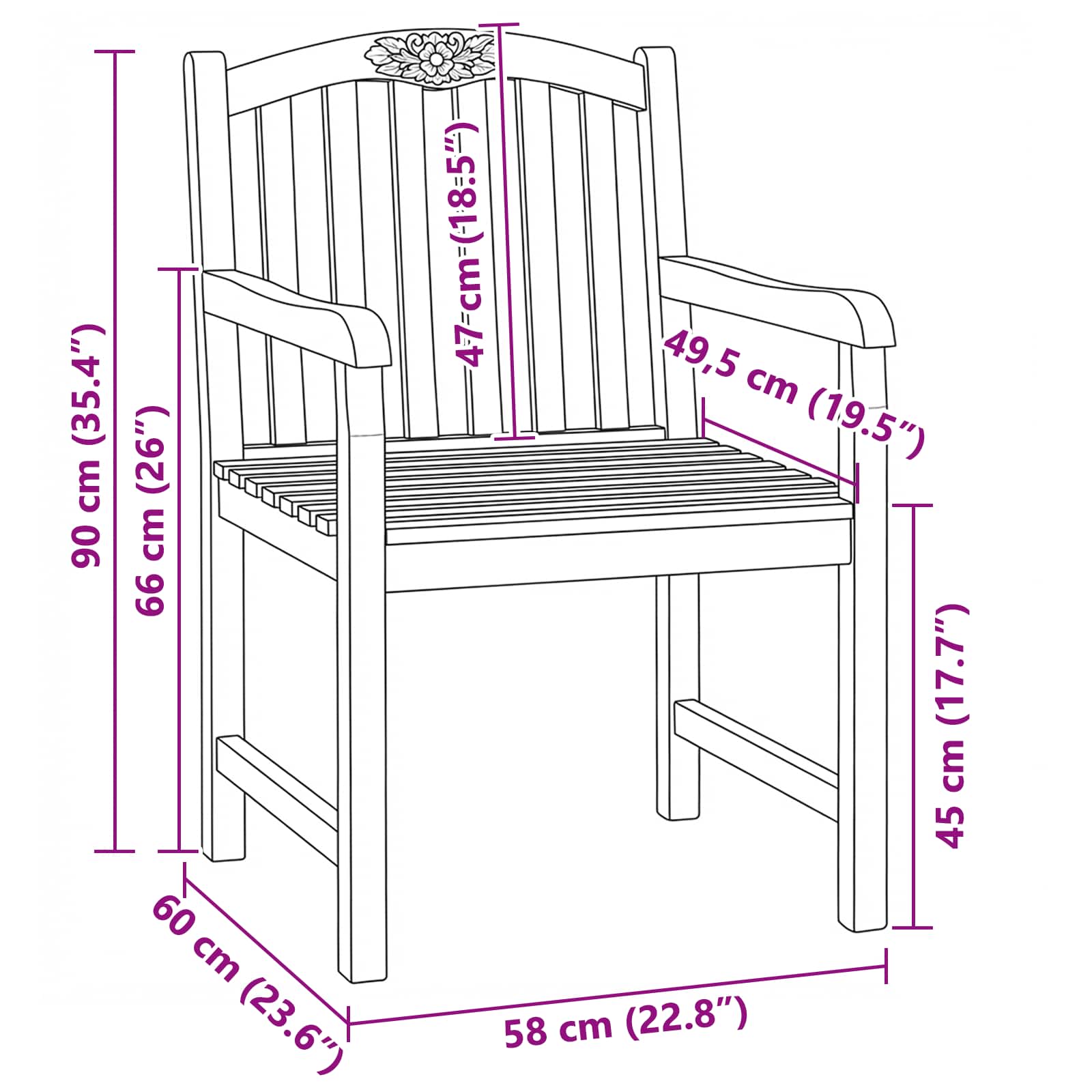 Ta vrtni stol je narejen iz trdnega tikovega lesa, na naslonjalu pa ima ročno izrezan motiv vrtnice. Njegova slatinasta zasnova zagotavlja stabilnost in podporo, robusten okvir pa je primeren za različne zunanji prostore. Ti stoli so odlična izbira za vrtnarske dogodke, terase ali sproščanje na dvorišču. Trden tikov les Izbran je zaradi trpežnosti in odpornosti na vreme, zaradi česar je stol idealna izbira za zunanje prostore. Njegova naravna struktura dodaja vizualno teksturo, lastnosti lesa pa podaljšujejo njegovo življenjsko dobo. Ročno izrezan motiv vrtnice Na vrhu naslonjala se nahaja edinstven, ročno izrezan motiv vrtnice. Ta obdelava dodaja poseben pečat in odraža umetniško obrt pri izdelavi pohištva. Slatna zasnova Zasnova slatinastega naslonjala nudi stabilno podporo in dober pretok zraka. Vsaka komponenta je skrbno načrtovana za funkcionalnost in udobje. Vsestrana uporaba Stoli se prilegajo različnim zunanjim prostorom, kot so terase, vrtovi ali skupni prostori. Primerne so za zunanje pogoje, kar zagotavlja funkcionalnost z robustnim okvirjem in premazom. Nizko vzdrževanje Zgrajen za udobje, ta stol zahteva minimalno vzdrževanje. Preprosto ga obrišite z krpo, da odstranite prah in zaščitite pred vremenskimi vplivi, da ohranite njegov videz.
