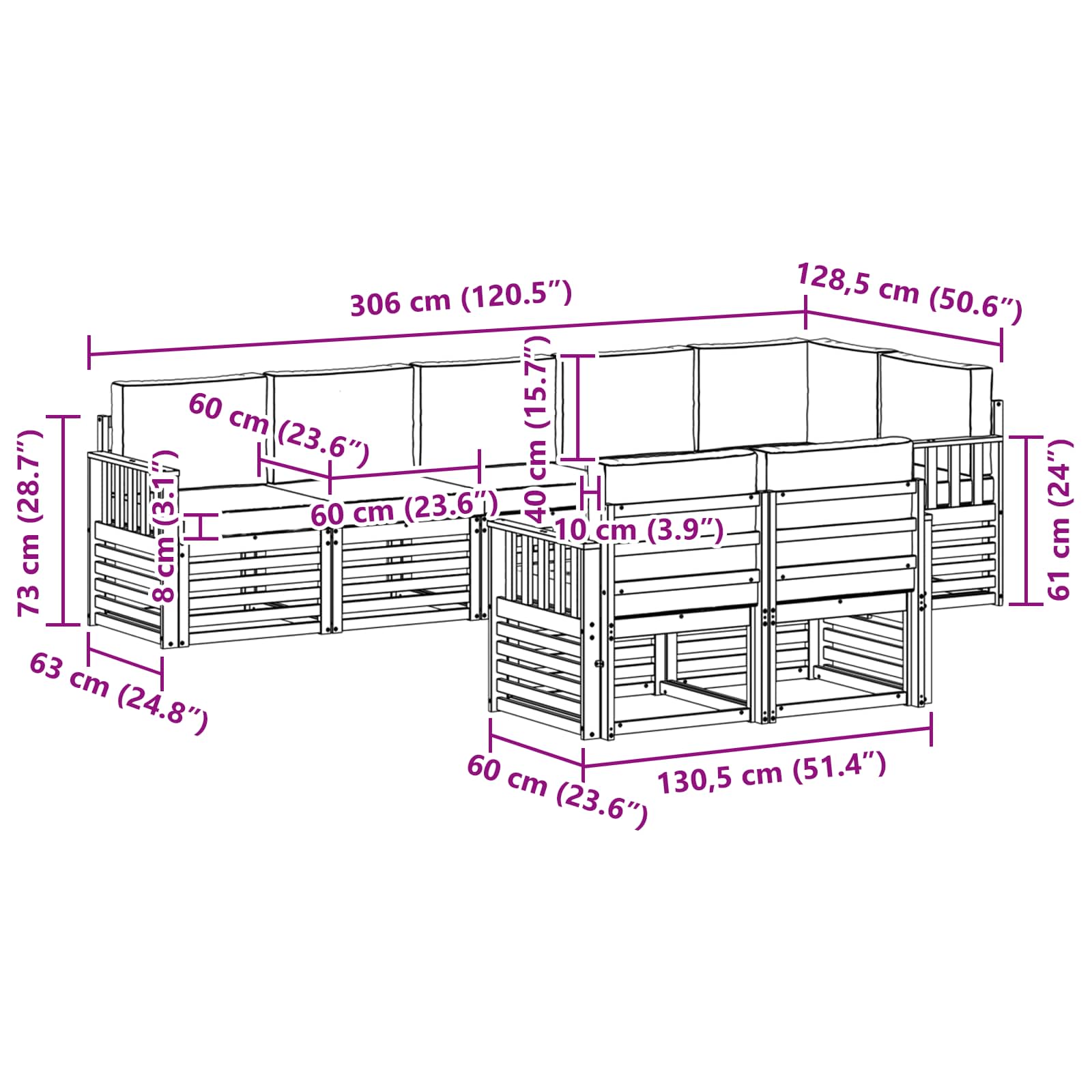 - 8 x Sedežna blazina: 60 x 60 x 8 cm (D x Š x V)