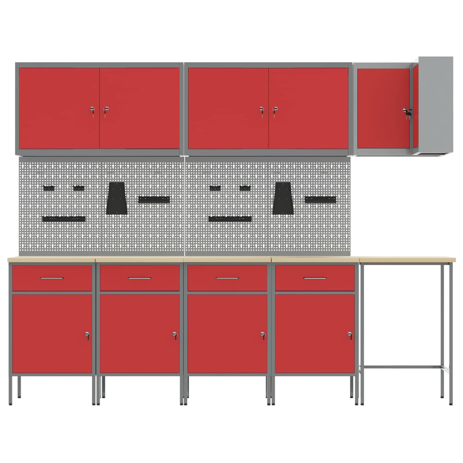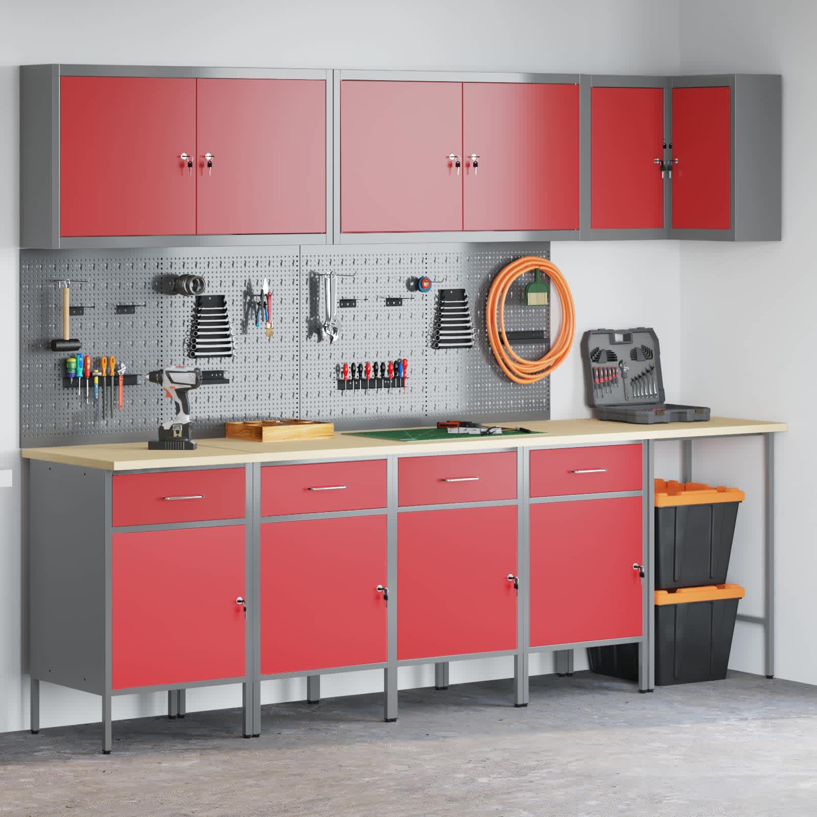 Set robustnih delovnih omaric ponuja stilno in funkcionalno rešitev za organizacijo orodja v vaši delavnici. S sodobno estetiko in čistimi linijami ta set združuje funkcionalnost in privlačen videz ter omogoča koheziven in profesionalen prostor. Materiali: Ta set je narejen iz praščno lakiranega jekla in inženirskega lesa, kar zagotavlja trdno in zanesljivo rešitev za shranjevanje orodij. Izbrali smo materiale zaradi njihove moči in vzdržljivosti, kar podaljšuje življenjsko dobo v različnih okoljih. Prašno lakirana površina nudi odpornost na obrabo, kar še dodatno povečuje trajnost omarice. Vključeni elementi: Set ima več predalov in ključavnice za varno shranjevanje orodja. Mehanizem ključavnice omogoča enostaven dostop in zagotavlja varnost, zato je ta set prava izbira za vsako delovno okolje. Nastavljive noge poskrbijo za stabilnost na neravnih površinah, kar zagotavlja, da omarica ostane na mestu. Funkcije / oblikovanje: Njegov sodoben dizajn se osredotoča na preprostost in funkcionalnost, kar omogoča enostavno vklapanje v različne stil delavnic. Čiste linije in minimalistični detajli ponujajo eleganten videz, hkrati pa nudijo praktično rešitev za organizacijo orodja. Nastavljive noge omogočajo prilagoditev po želji uporabnika. Priporočena uporaba: Ta set je zasnovan za notranjo uporabo in je idealen za delavnice, kjer sta organizacija in učinkovitost ključnega pomena. Ne glede na to, ali gre za profesionalno ali domačo delavnico, zagotavlja urejeno postavitev orodij, kar povečuje dostopnost in produktivnost. Negovanje: Sestava zahteva dva človeka in izvijač za natančno delo. Redno vzdrževanje vključuje preverjanje ključavnic in prilagajanje nog, da se zagotovi stabilnost in funkcionalnost.