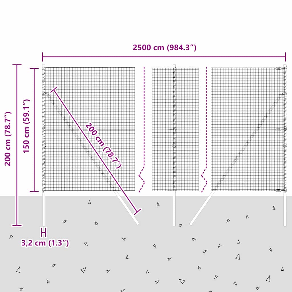 - Splošne dimenzije: 2500 x 3,2 x 150 cm (D x Š x V)