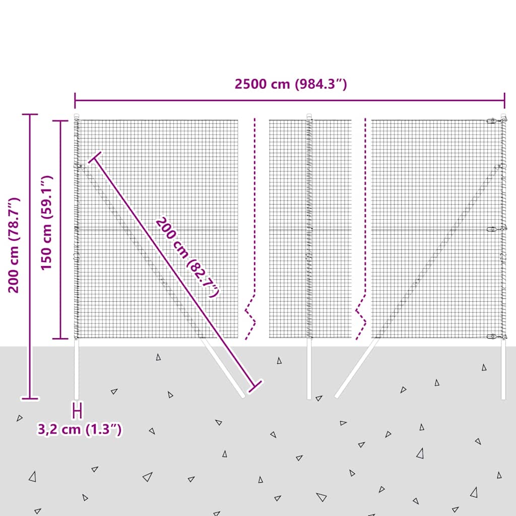 • Splošne dimenzije: 2500 x 3,2 x 150 cm (D x Š x V)