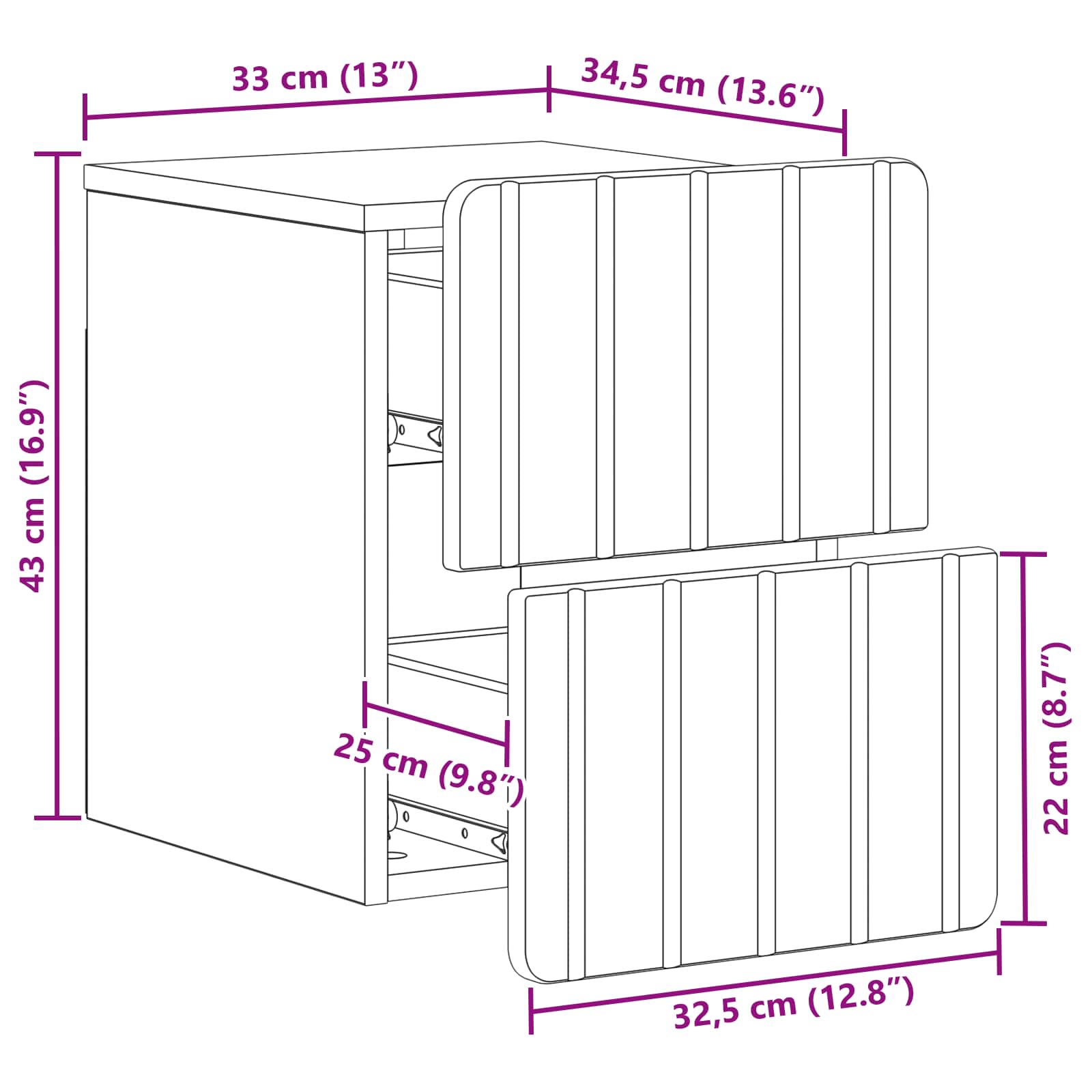 - Splošne dimenzije: 33 x 34,5 x 43 cm (D x Š x V)
