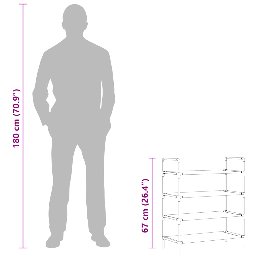 To minimalistično stojalo za čevlje predstavlja idealno rešitev za shranjevanje vaših čevljev. Ima cevasti kovinski okvir, ki je lahek ampak čvrst, zato je stojalo za čevlje preprosto za premikanje in precej trpežno. Ima štiri prostorne police, ki so izdelane iz netkanega blaga, ponuja pa veliko prostora za organizirano shranjevanje vaših čevljev. Montaža je preprosta.
