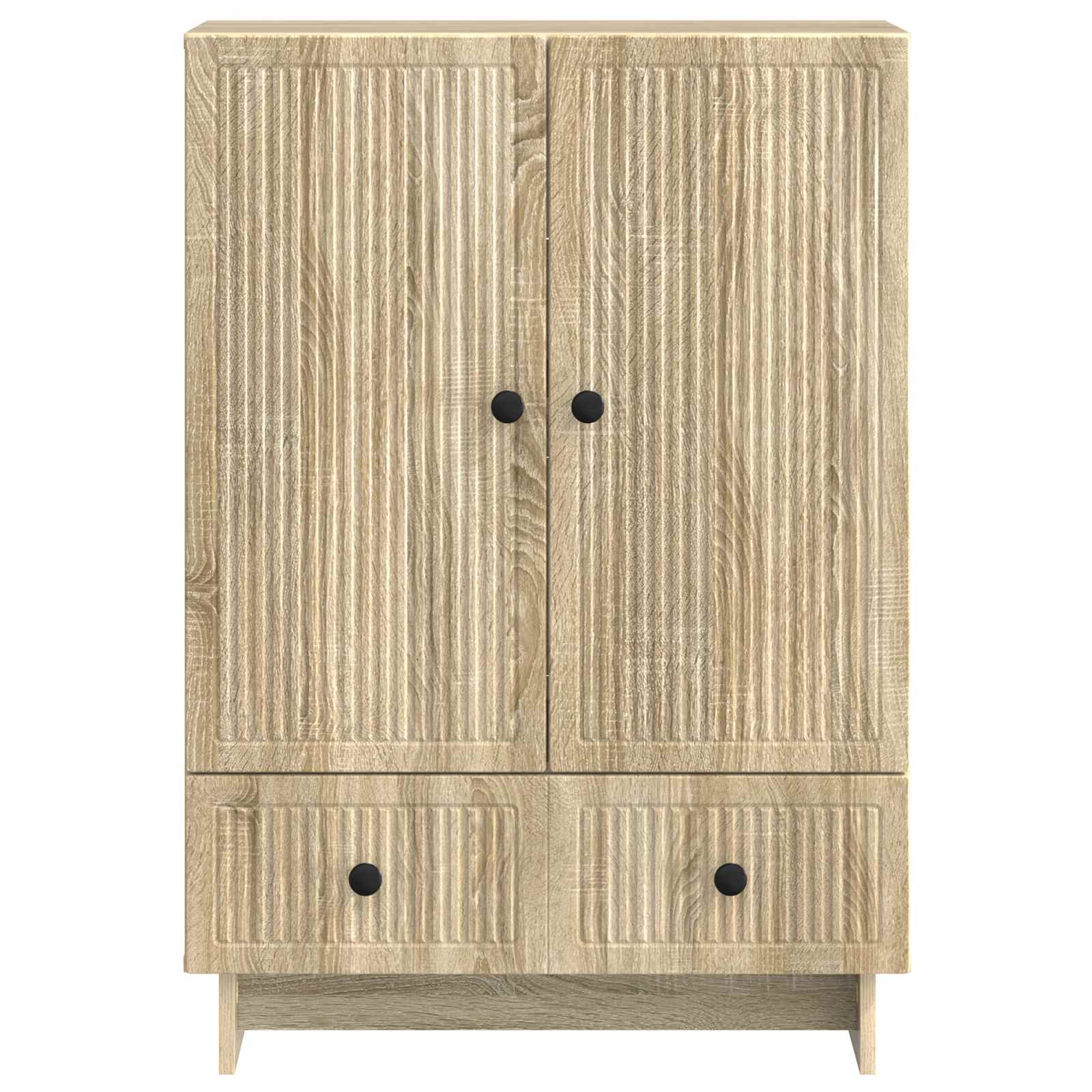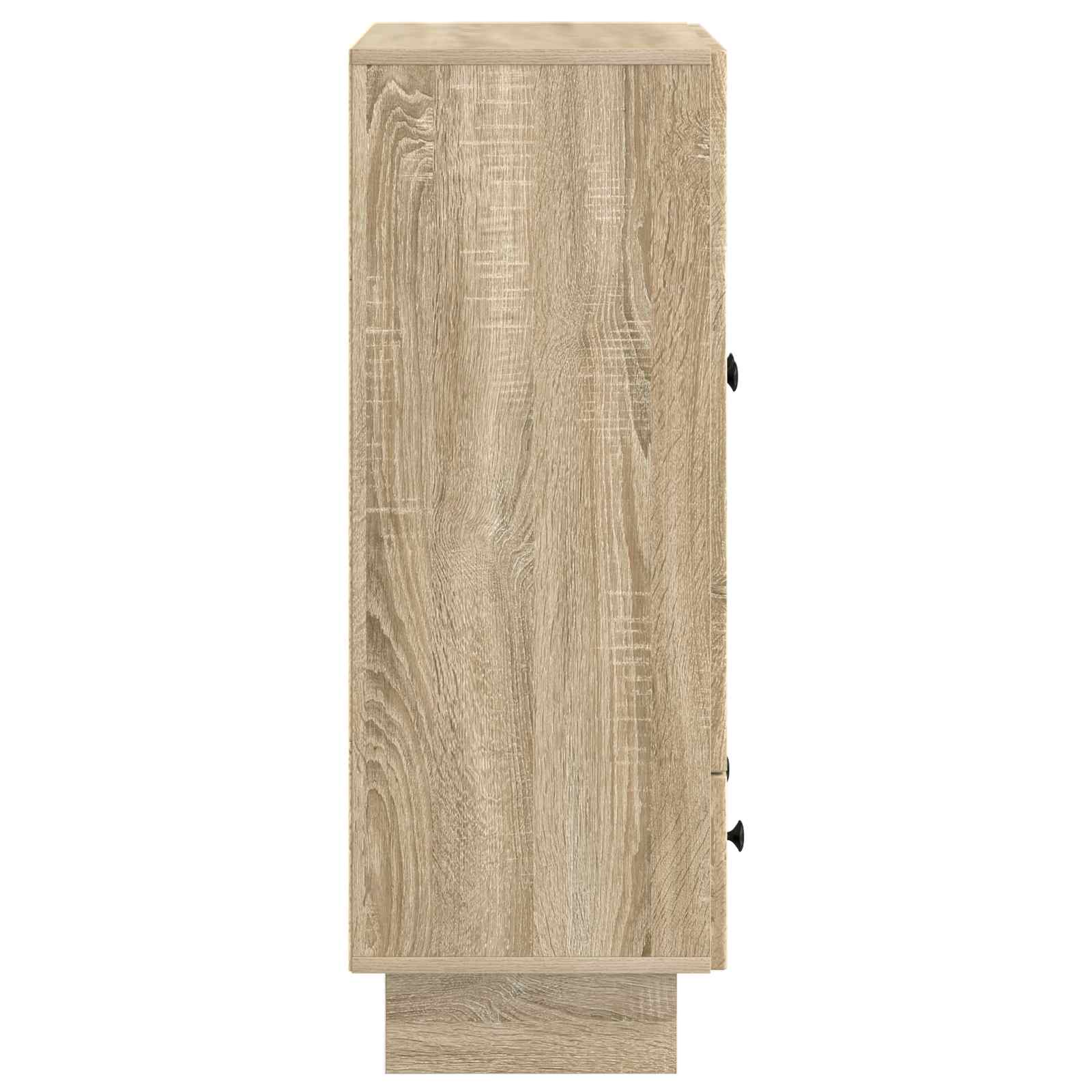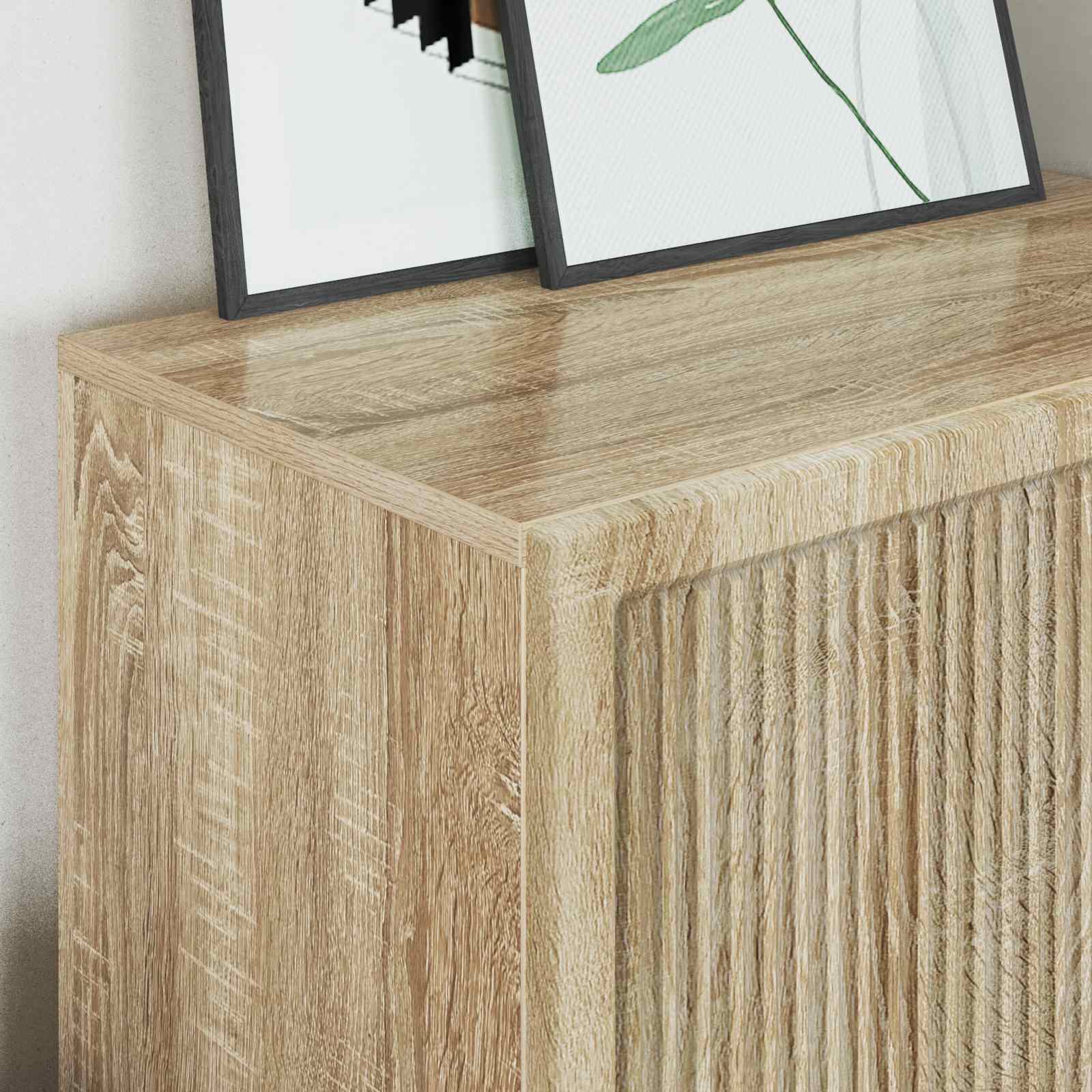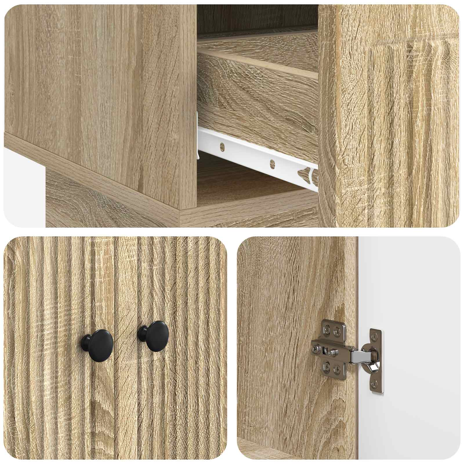 Ta sideboard je odličen na mesto, kjer se praktičnost in lep izgled srečata. Njegova pametna zasnova in dovolj shranjevanja bosta pomagala pri vsakodnevnem organiziranju, hkrati pa bo prostor ostal lep in urejen. Uporaben je v dnevnih sobah, jedilnicah ali kjerkoli drugje, ponuja zanesljivo shranjevanje, ki se odlično prilega sodobnemu načinu življenja in različnim stilom notranje opreme. Iz inženirskega lesa: Ta sideboard je zasnovan za vzdržljivost in zanesljivost. Material nudi gladko površino ter stabilnost, kar pomeni, da ga lahko dolgotrajno uporabljate doma. Prostor za shranjevanje: Zasnovan tako, da podpira vaše organizacijske potrebe, ta sideboard vključuje predale in vrata, kjer lahko shranite vse potrebne stvari, kar pa obdrži prostor urejen in funkcionalen. Klasika dizajn: Sideboard ima odlično kombinacijo klasičnega in sodobnega sloga. Njegov eleganten videz se brez težav poda v različne prostore, služi obojestranskemu namenu brez preobremenitve dekorja. Enostavna sestava: Postavitev sideboarda je enostavna in ne zahteva posebnih orodij. Kljub preprosti gradnji omogoča, da ga hitro in brez težav sestavite. Enostavno vzdrževanje: Redna nega je zelo enostavna, samo občasno obrišite s krpo. Ta zasnova z nizkim vzdrževanjem je odlična za vsakodnevno uporabo, saj ohranja videz skozi čas.