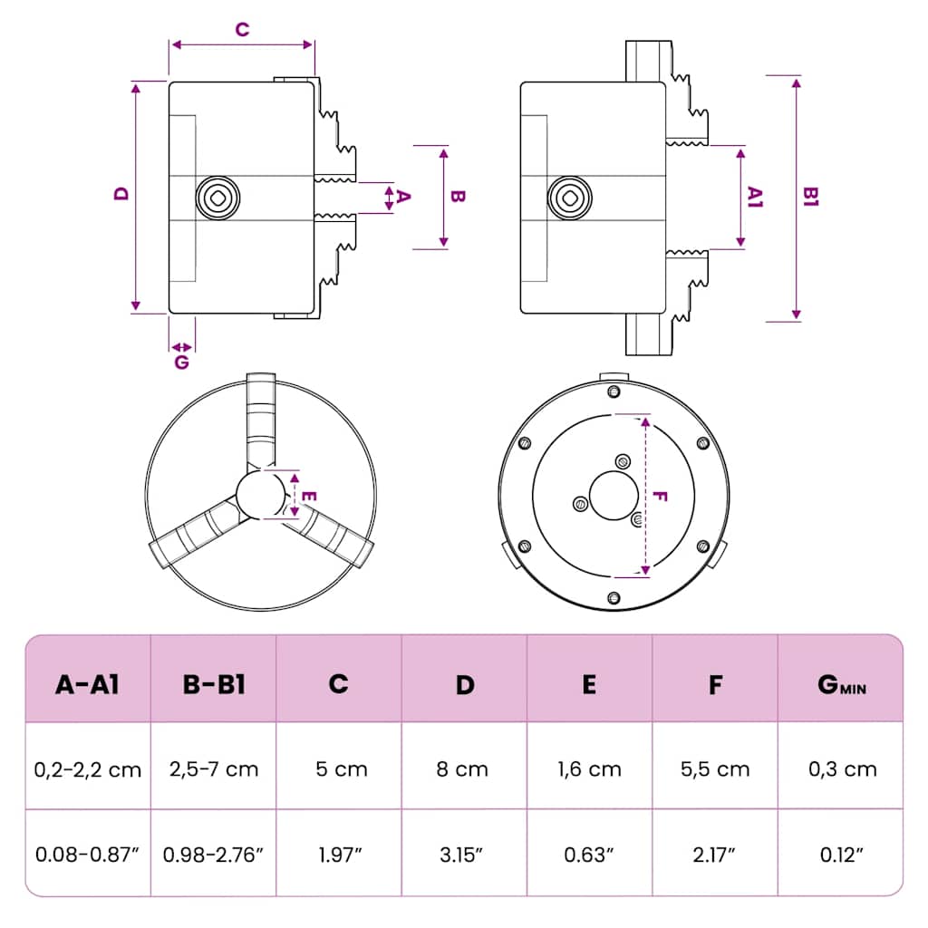 Vpenjalna stružna glava s 3 čeljustmi in samodejnim centriranjem je primerna za različna dela. Tako si boste razširili možnosti za izdelovanje originalnih dizajnov. Zagotavlja natančno vpenjanje na različnih površinah, kot so trdni ali votli okrogli materiali ter trikotni ali šestkotni materiali. Izdelana je iz visokokakovostnega jekla z visoko trdnostjo in odpornostjo na uporabo, zato je močna in vzdržljiva. Ta stružna glava ima dizajn s 3 čeljustmi, samodejno centriranje, kompaktno velikost in je preprosta za uporabo.