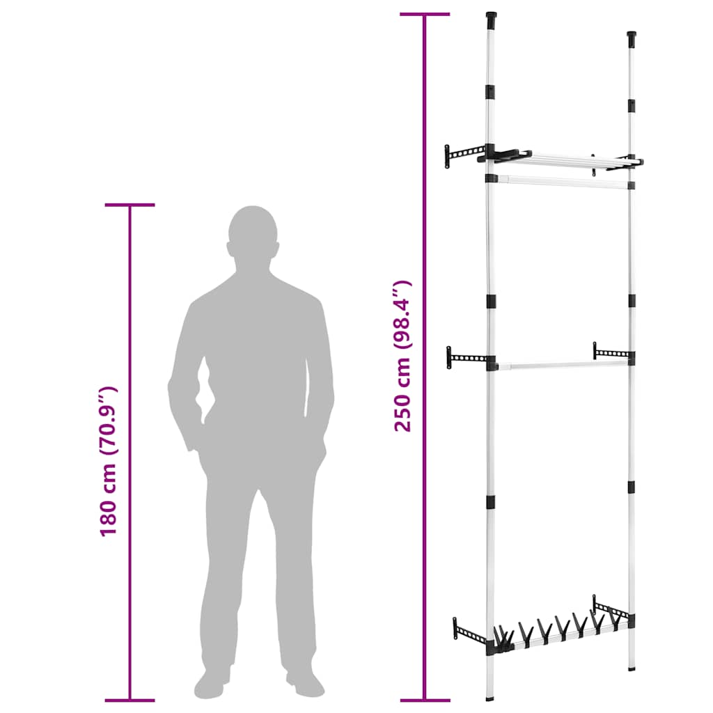 Naše teleskopsko stojalo za oblačila s preprostim dizajnom bo prihranilo prostor v vaši spalnici ali drugem prostoru. Teleskopski garderobni sistem iz aluminija je močan in trden. To stojalo za shranjevanje je nastavljivo glede na različne prostorske postavitve, saj ima teleskopski sistem in nastavljivo višino in širino. Ponuja edinstven in genialen način za organiziranje omare. Organizirajte svoja oblačila in pospravite svojo sobo z našim teleskopskim organizacijskim sistemom za omaro!