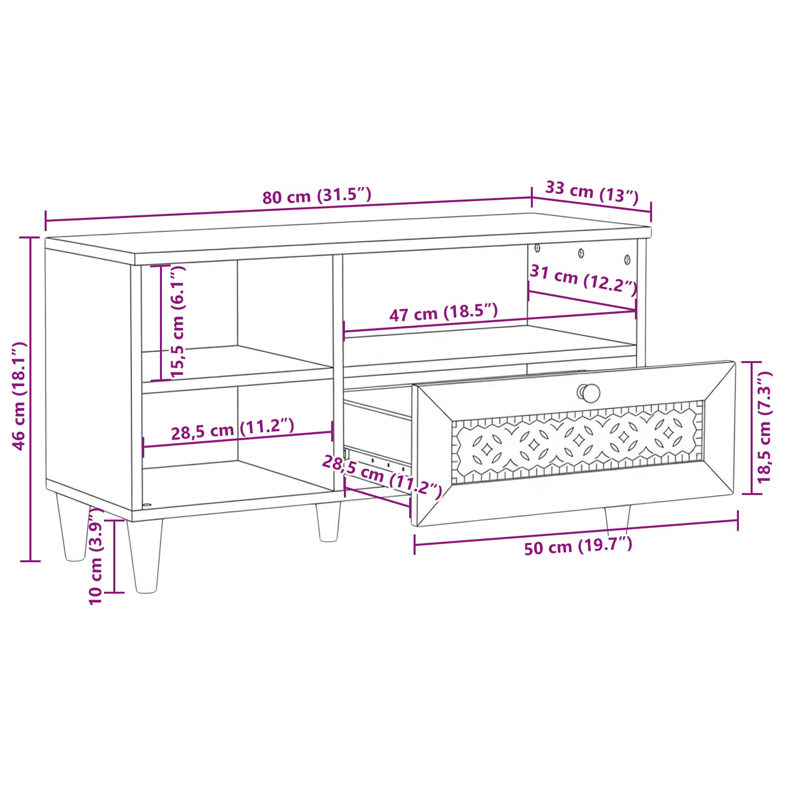 - Splošne dimenzije: 80 x 33 x 46 cm (D x Š x V)