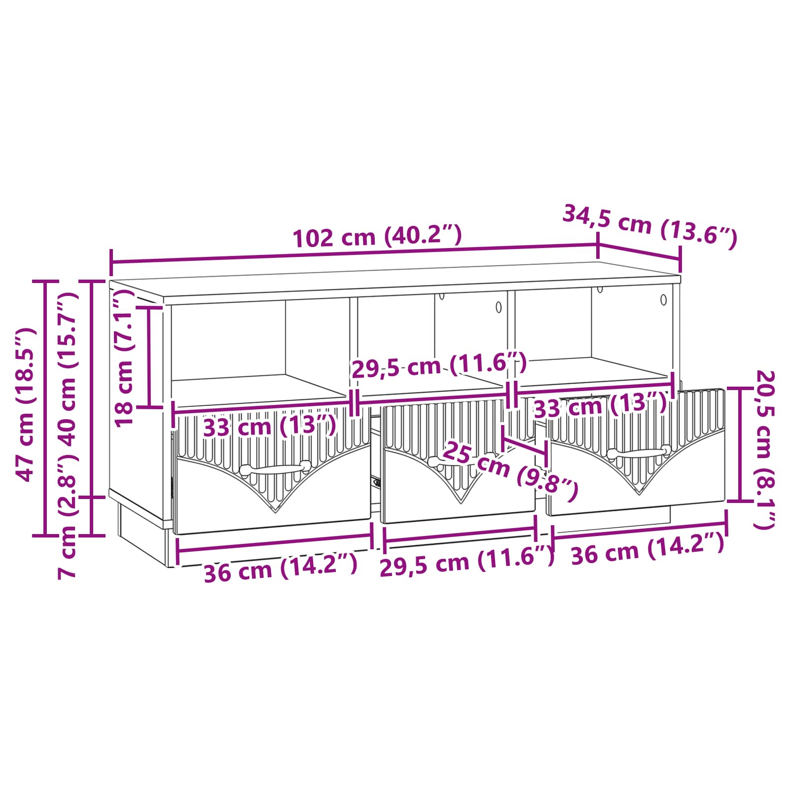 - Splošne dimenzije: 102 x 34,5 x 47 cm (D x Š x V)