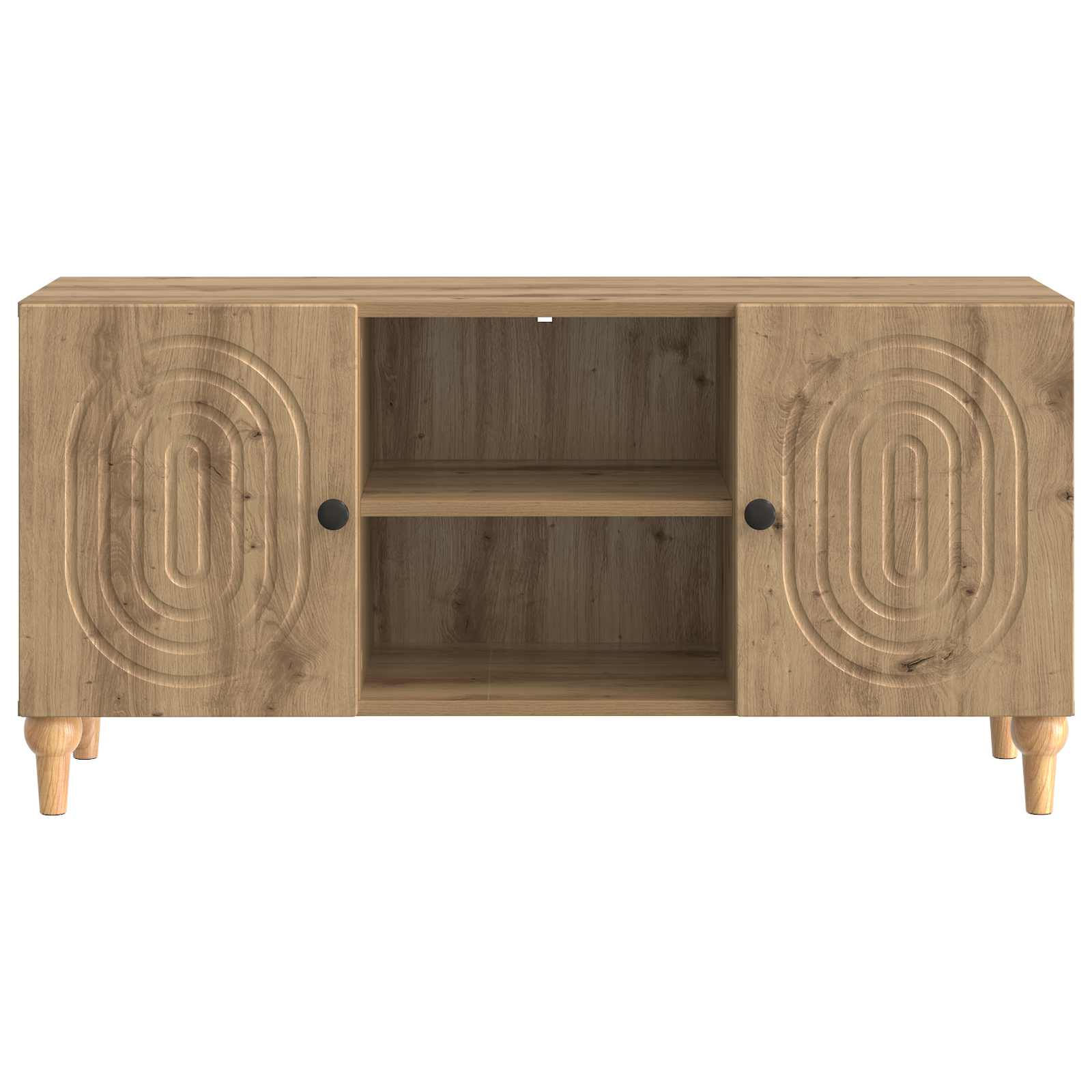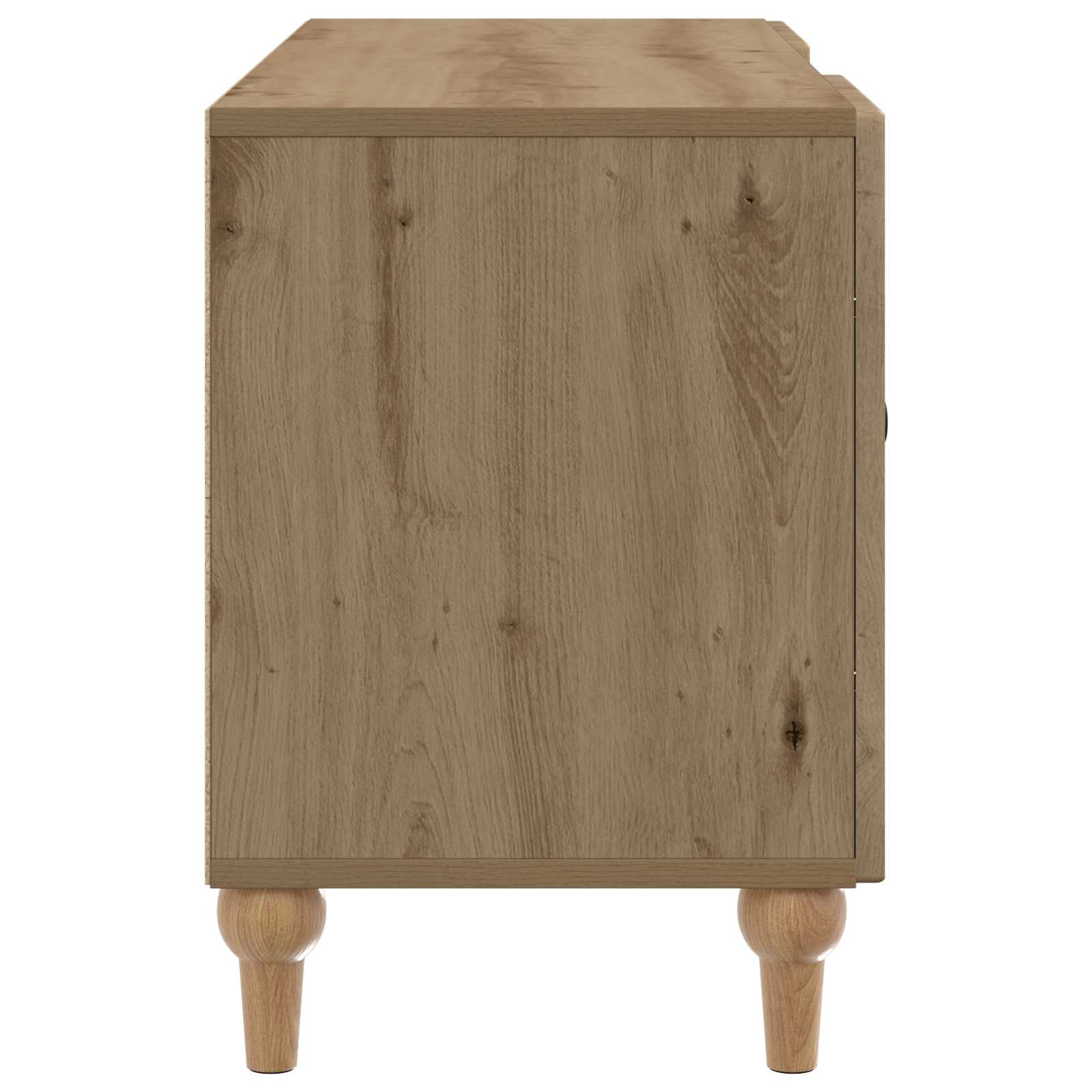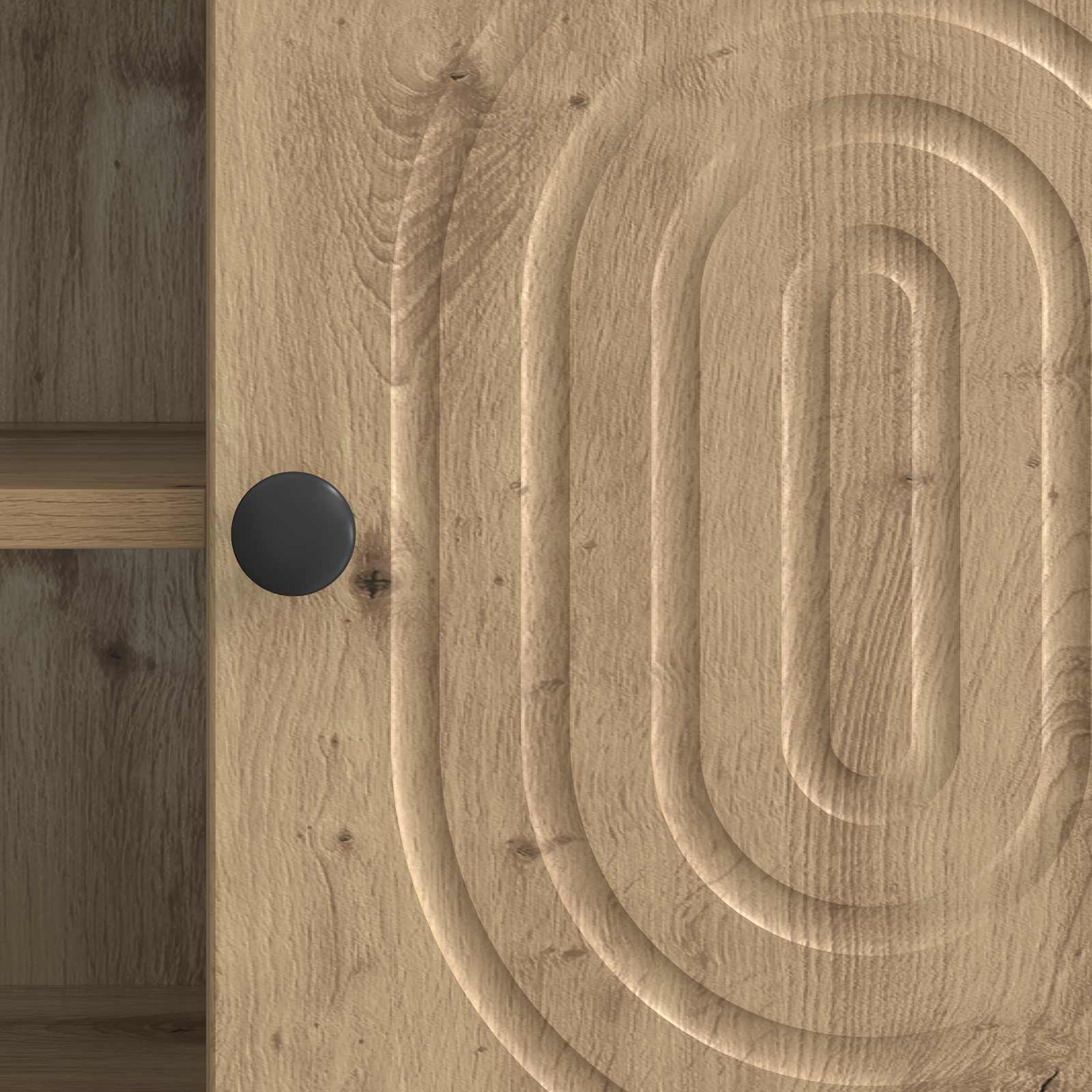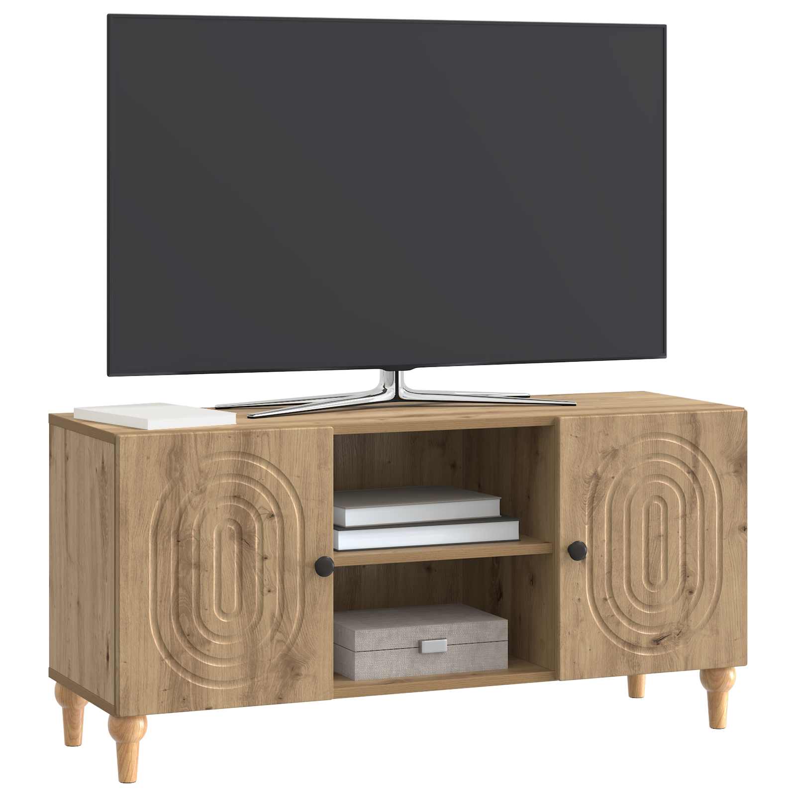 Ta TV regal je zasnovan s sodobnostjo v mislih, kar se odlično poda vsaki moderni dnevni sobi. Njegov eleganten slog in praktične lastnosti so idealni za organizacijo medijske opreme in ostalih stvari, kar tvojemu prostoru doda privlačen videz in red. S svojo ožjo zasnovo je ta regal stilsko in praktično dopolnilo tvojemu domu. Gradnja iz inženirskega lesa Ta TV regal je narejen iz inženirskega lesa, kar mu daje enotno in trpežno površino, ki je odporna na obrabo. Močna podlaga zagotavlja dolgo življenjsko dobo, tudi pri pogosto rabi, in je odlična naložba za vsako dnevno sobo. Funkcionalne police Regal ima mnoge funkcionalne police, ki nudijo dovolj prostora za elektronske naprave, knjige ali dekoracijo. Pametna razporeditev zagotavlja, da so stvari vedno organizirane in na dosegu roke, kar povečuje uporabност prostora. Vrata s 90° zavrtljivimi tečaji S 90° zavrtljivimi tečaji so predali enostavno dostopni, kar poenostavi shranjevanje ali jemanje predmetov. Dobro zasnovani gumbi nudijo udoben oprijem, kar dela delovanje regalov preprosto in neopazno. Sodoben minimalističen slog Ta miren dizajn se dobro združuje z različnimi stili notranje opreme. Čiste črte in vzorčasti robovi poudarjajo minimalistični videz, kar ga naredi povsem primerno izbiro za moderne in tradicionalne prostore. Enostavna navodila za nego Vzdrževanje tega regala je enostavno; le obrišite z vlažno krpo, da odstranite prah in odtise. Ta nizkokakovosten pristop ohranja izgled in funkcionalnost lesa skozi čas.
