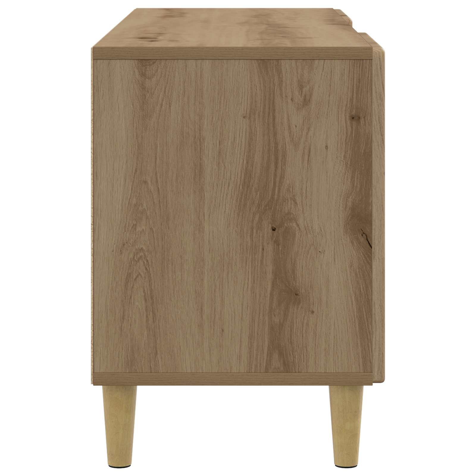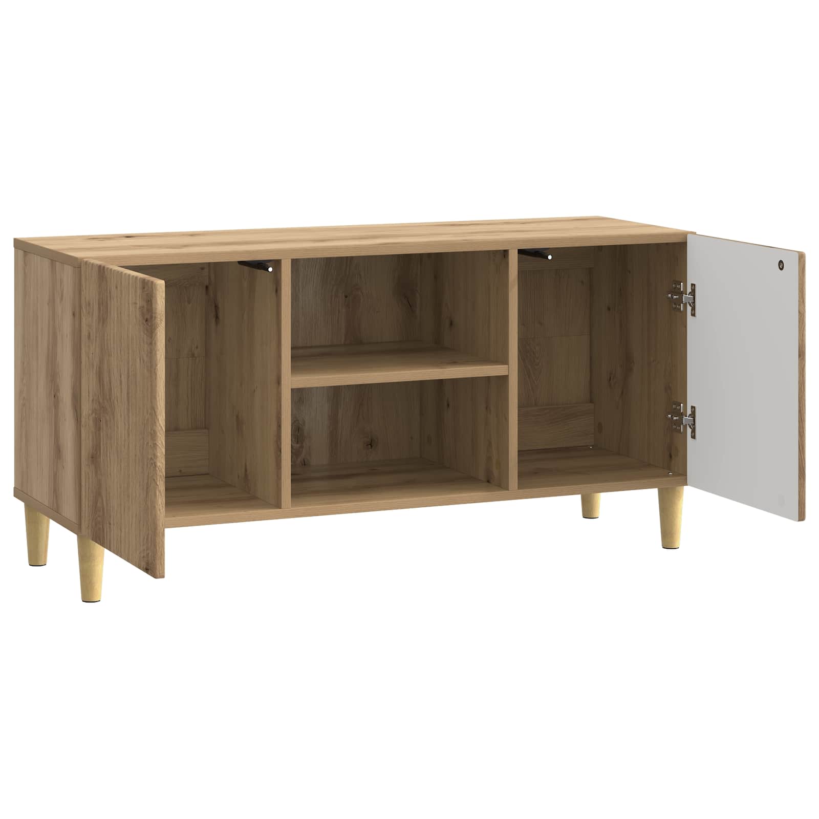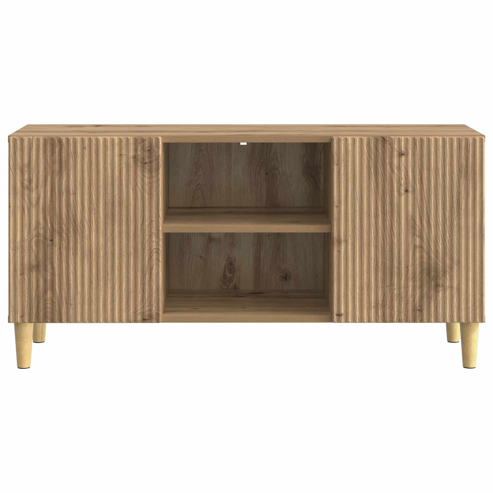 Ta Moderni TV Kabinet je odlična izbira za dnevno sobo, saj združuje vintage čar in sodobno funkcionalnost. Njegova pravokotna oblika je privlačna in praktična, kar ga dela primernega za različne sloge, od sodobnih do vintage. Z obiljem shranjevanja je super za organizacijo medijske opreme, knjig in dekorativnih elementov, kar daje vsakemu dnevnemu prostoru bolj urejen videz. Njegova kompaktna, a prostorna zasnova omogoča, da se dobro prilega različnim velikostim sob in je idealna rešitev za vse okoliščine. Gradnja iz inženirskega lesa : Ta kabinet je izdelan iz inženirskega lesa, kar mu daje vzdržljivost in lep videz. Inženirski les zagotavlja enotno kakovost in gladko površino ter dolgotrajno osnovo, ki prenese vsakodnevno rabo. Ta material je tudi okolju prijazen. Njegova oblikovalna struktura je lepa in enostavna za vzdrževanje. Vrata s tečajem : Opremljen z 90° vrtnimi vrati, ta kabinet omogoča enostaven dostop do shranjenih stvari, kar ga dela zelo uporabnega. Vrata se fino odpirajo navzven, kar povečuje dostop do medijskih naprav, knjig ali okrasnih elementov. Njihova oblika doda vintage občutek kabineta, kar je super za povezavo stila in funkcionalnosti. Obilne policne površine : Ta TV kabinet ima več nivojev shranjevanja z lesnimi policami. Te police so odlične za dobro organizacijo elektronskih naprav, DVD-jev in dekorativnih elementov, kar omogoča, da je prostor urejen in estetsko dodelan. Razporeditev polic optimizira prostor, kar je ključno za sodobne domove. Zožene noge z elegantno zasnovo : Ta kabinet stoji na zoženih nogah, ki mu dajejo eleganco in stabilnost. Noge se zožujejo navzdol, kar prinaša sodoben in sofisticiran videz, ki se ujema z različnimi stili notranjosti. Ta zasnova doda gracioznost in stabilnost vsakemu prostoru. Navodila za nego in vzdrževanje : Za ohranjanje tega super kosa je potrebno le obrisati z vlažno krpo, da ostane v dobrem stanju. Redno odstranjevanje prahu zagotavlja, da ohranjate njegovo vintage privlačnost. Izogibajte se ostrim kemikalijam, da ohranite lepo končno obdelavo in strukturo kabineta.