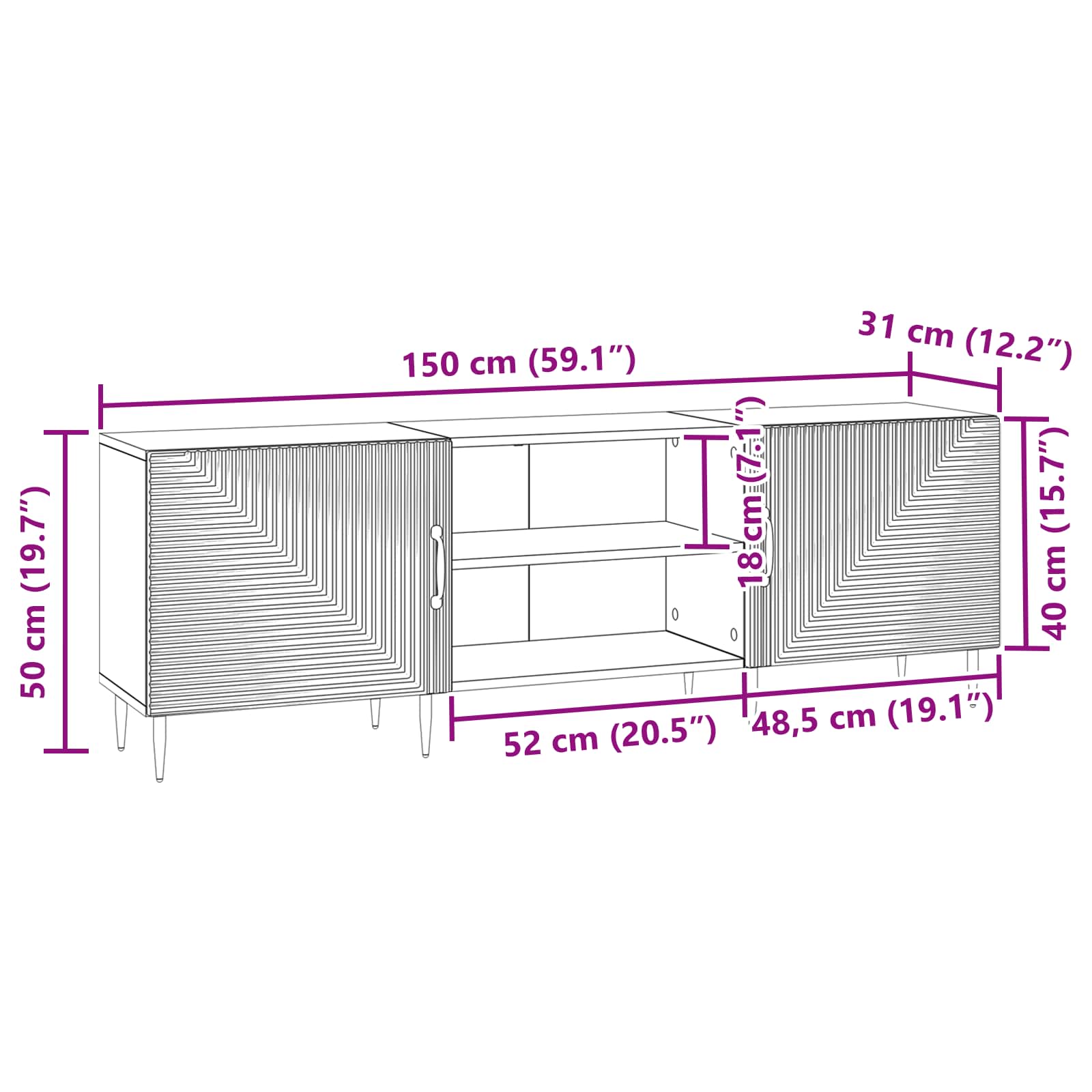 - Splošne dimenzije: 150 x 31 x 50 cm (D x Š x V)