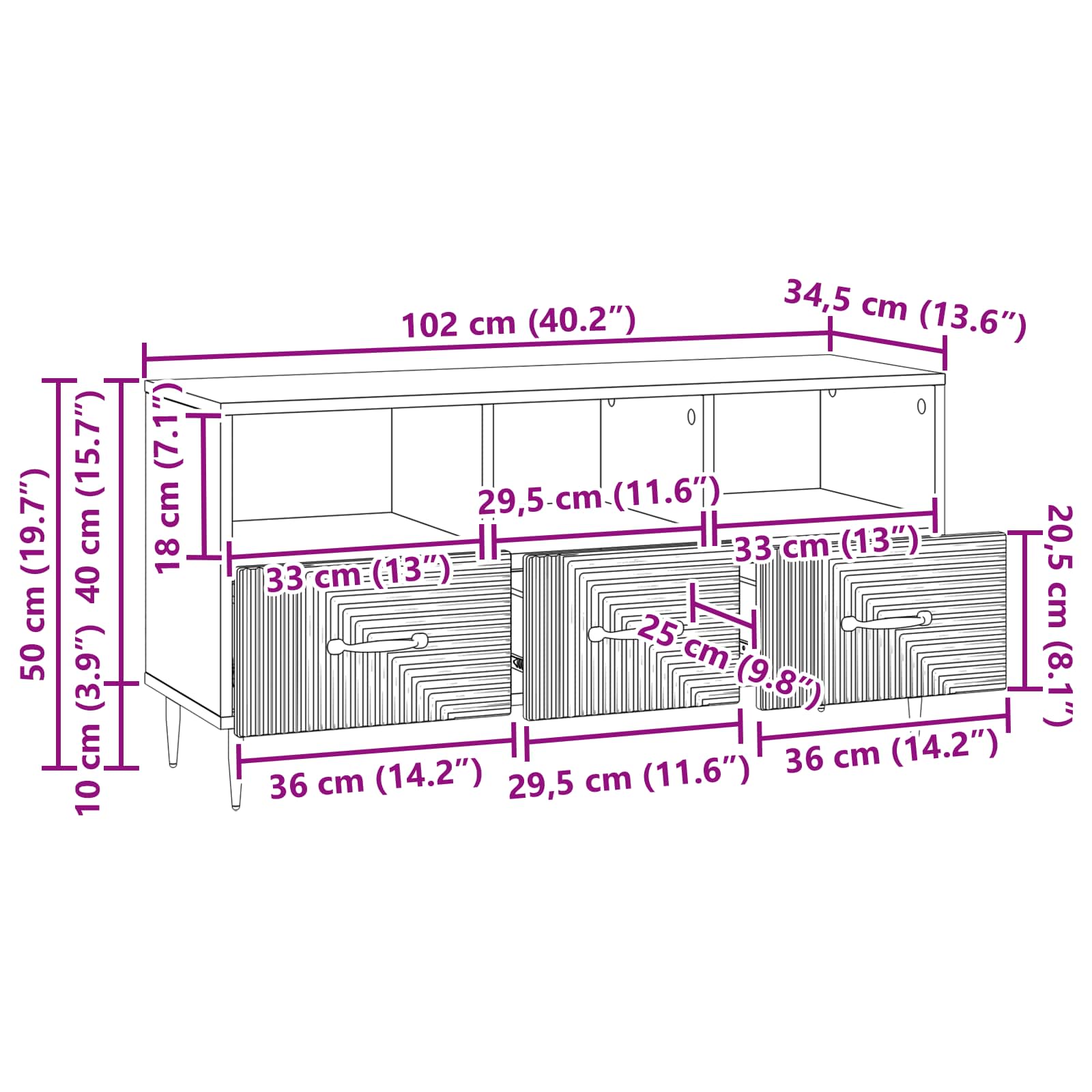- Splošne dimenzije: 102 x 34,5 x 50 cm (D x Š x V)