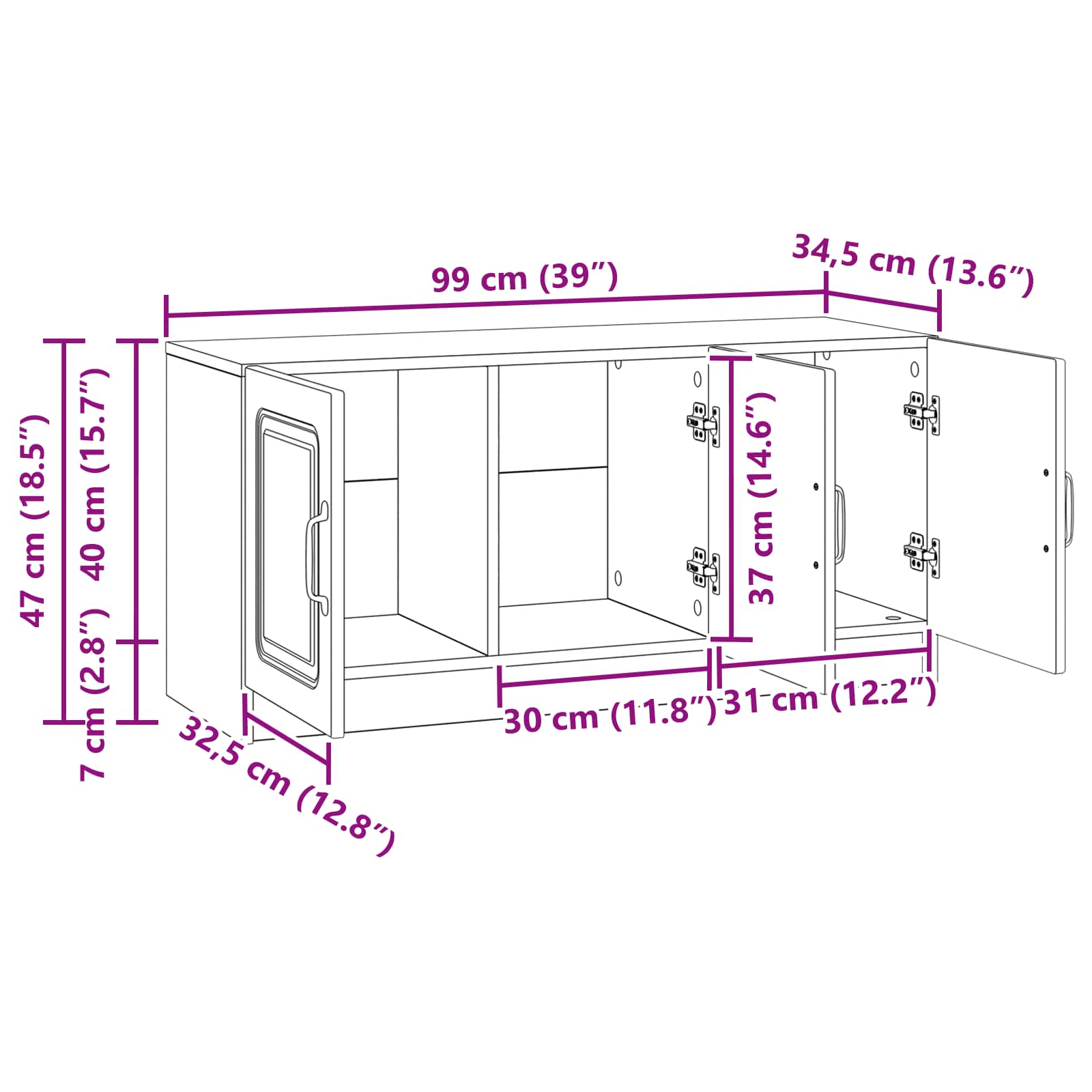 - Splošne dimenzije: 99 x 34,5 x 47 cm (D x Š x V)