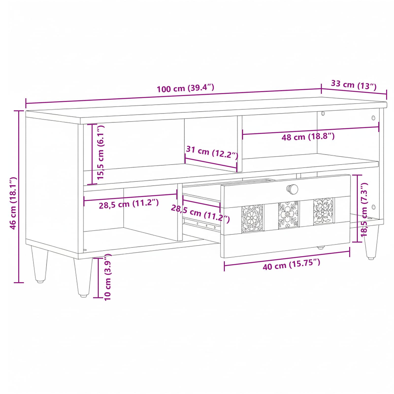 - Splošne dimenzije: 100 x 33,5 x 46 cm (D x Š x V)