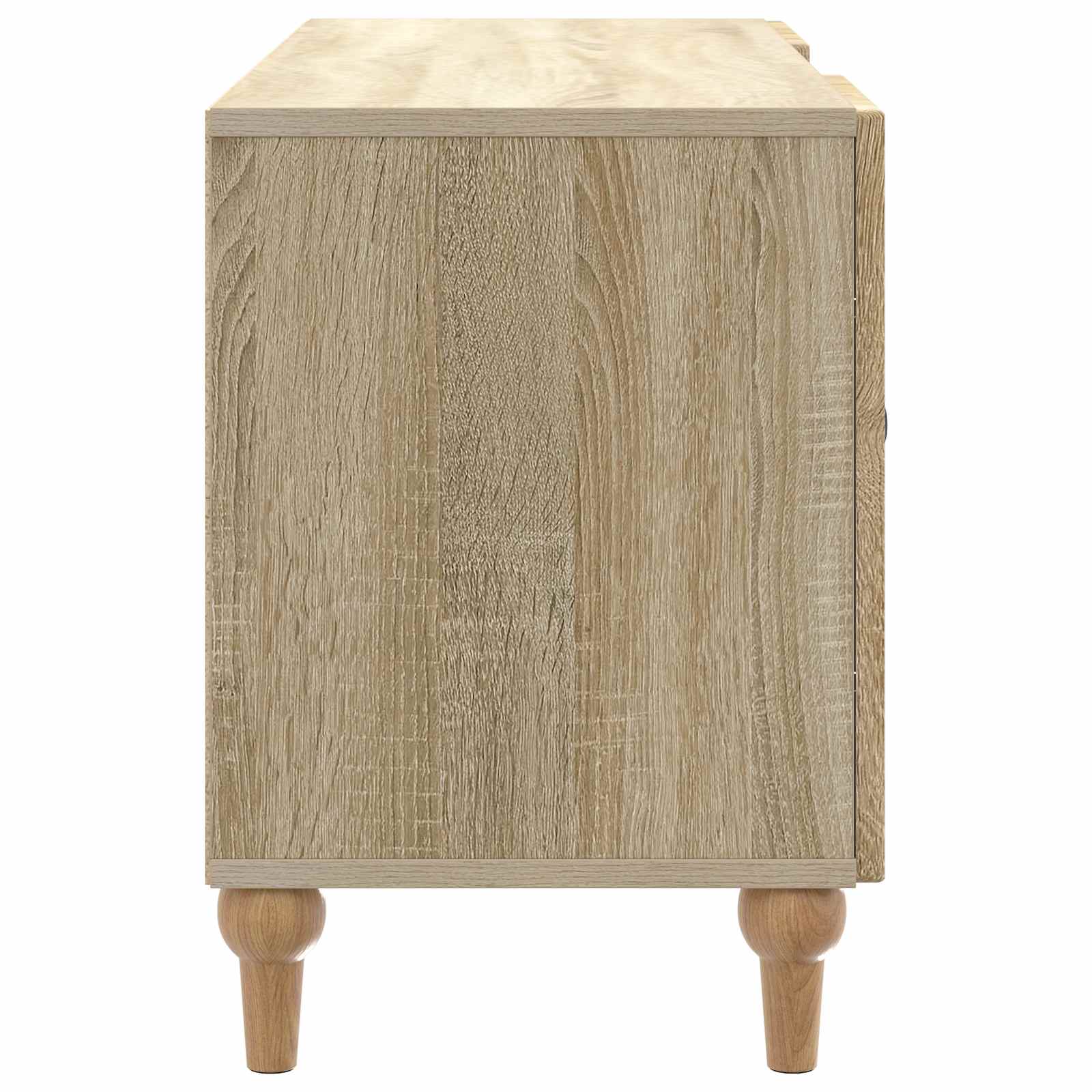 Ta TV regal je zasnovan s sodobnostjo v mislih, kar se odlično poda vsaki moderni dnevni sobi. Njegov eleganten slog in praktične lastnosti so idealni za organizacijo medijske opreme in ostalih stvari, kar tvojemu prostoru doda privlačen videz in red. S svojo ožjo zasnovo je ta regal stilsko in praktično dopolnilo tvojemu domu. Gradnja iz inženirskega lesa Ta TV regal je narejen iz inženirskega lesa, kar mu daje enotno in trpežno površino, ki je odporna na obrabo. Močna podlaga zagotavlja dolgo življenjsko dobo, tudi pri pogosto rabi, in je odlična naložba za vsako dnevno sobo. Funkcionalne police Regal ima mnoge funkcionalne police, ki nudijo dovolj prostora za elektronske naprave, knjige ali dekoracijo. Pametna razporeditev zagotavlja, da so stvari vedno organizirane in na dosegu roke, kar povečuje uporabност prostora. Vrata s 90° zavrtljivimi tečaji S 90° zavrtljivimi tečaji so predali enostavno dostopni, kar poenostavi shranjevanje ali jemanje predmetov. Dobro zasnovani gumbi nudijo udoben oprijem, kar dela delovanje regalov preprosto in neopazno. Sodoben minimalističen slog Ta miren dizajn se dobro združuje z različnimi stili notranje opreme. Čiste črte in vzorčasti robovi poudarjajo minimalistični videz, kar ga naredi povsem primerno izbiro za moderne in tradicionalne prostore. Enostavna navodila za nego Vzdrževanje tega regala je enostavno; le obrišite z vlažno krpo, da odstranite prah in odtise. Ta nizkokakovosten pristop ohranja izgled in funkcionalnost lesa skozi čas.