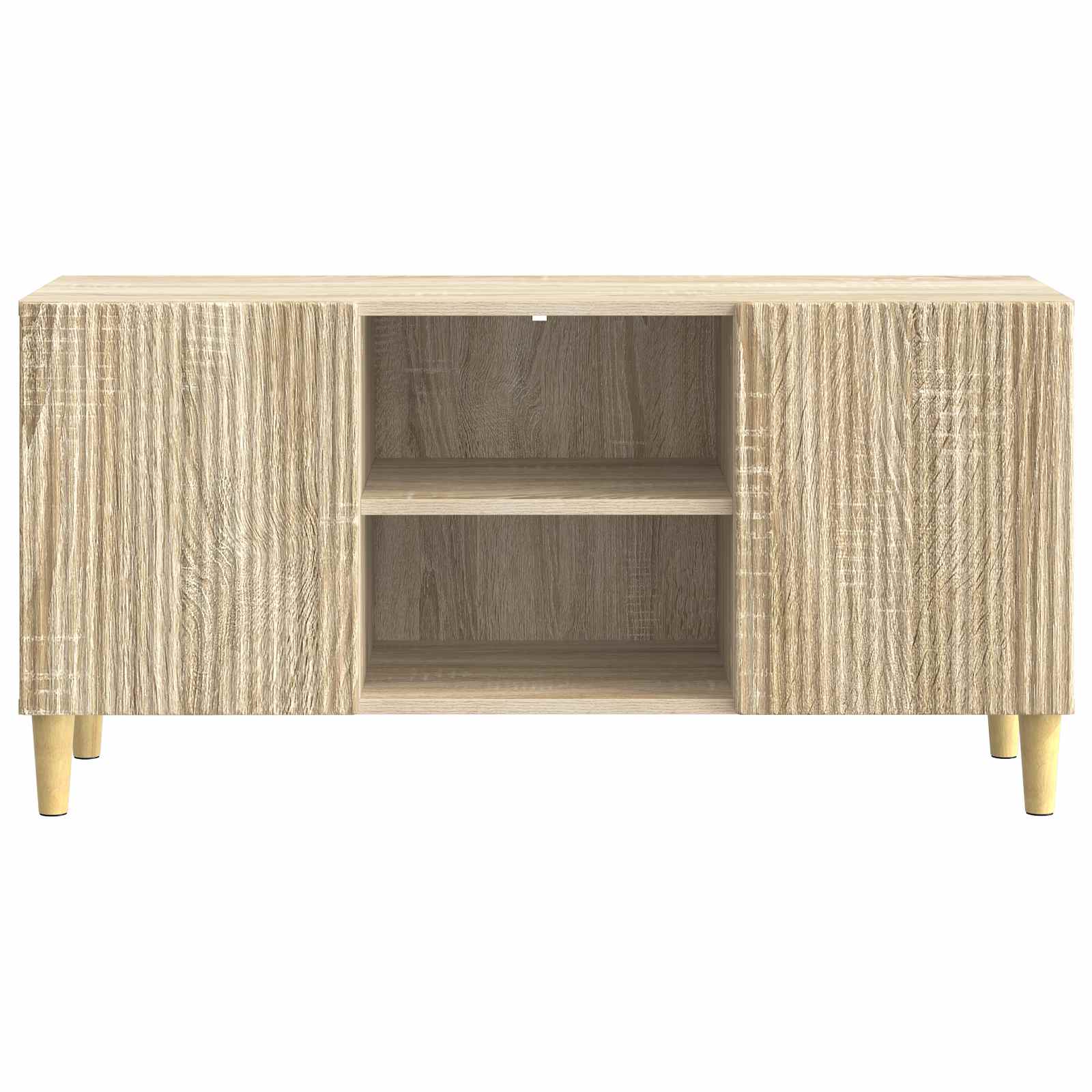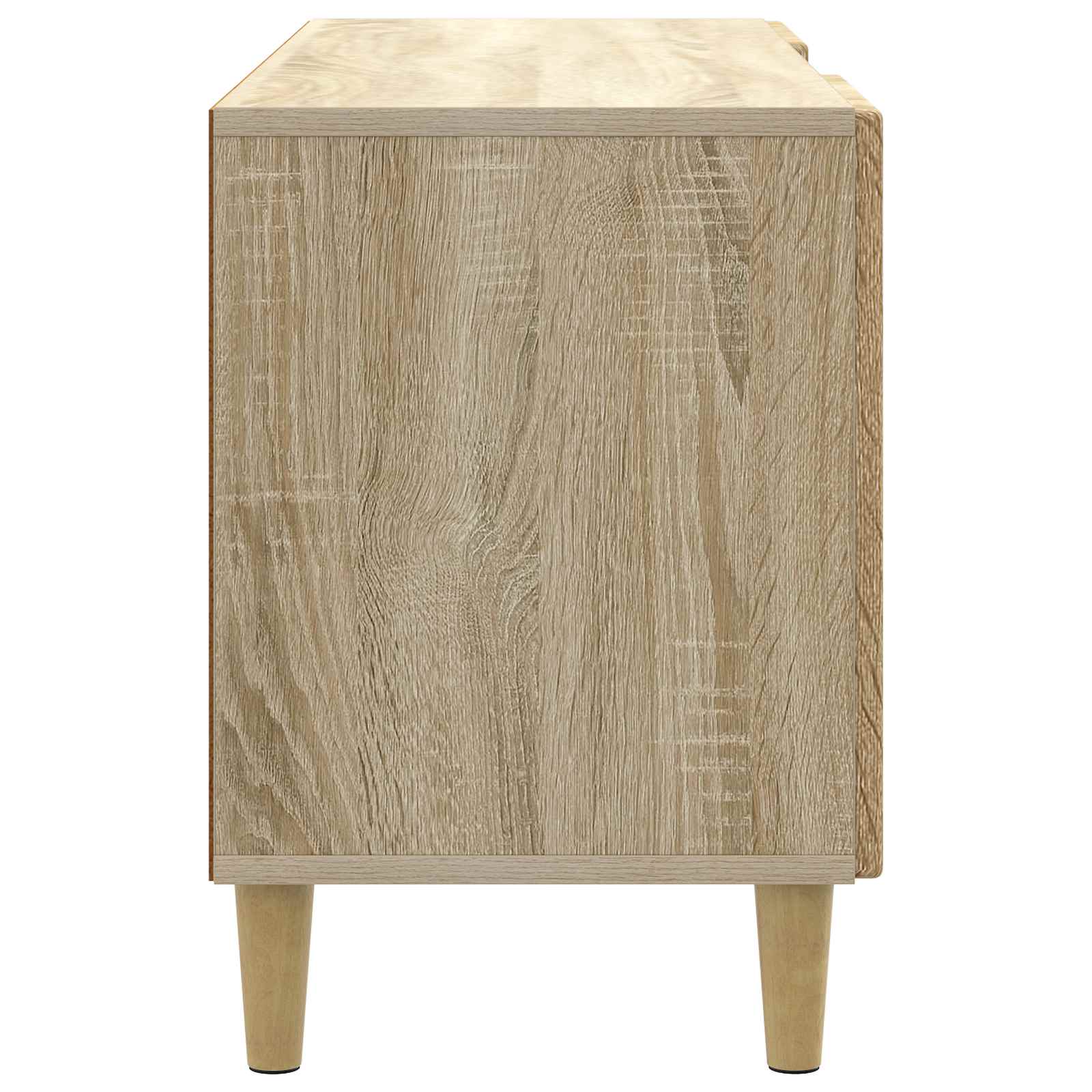 Ta Moderni TV Kabinet je odlična izbira za dnevno sobo, saj združuje vintage čar in sodobno funkcionalnost. Njegova pravokotna oblika je privlačna in praktična, kar ga dela primernega za različne sloge, od sodobnih do vintage. Z obiljem shranjevanja je super za organizacijo medijske opreme, knjig in dekorativnih elementov, kar daje vsakemu dnevnemu prostoru bolj urejen videz. Njegova kompaktna, a prostorna zasnova omogoča, da se dobro prilega različnim velikostim sob in je idealna rešitev za vse okoliščine. Gradnja iz inženirskega lesa : Ta kabinet je izdelan iz inženirskega lesa, kar mu daje vzdržljivost in lep videz. Inženirski les zagotavlja enotno kakovost in gladko površino ter dolgotrajno osnovo, ki prenese vsakodnevno rabo. Ta material je tudi okolju prijazen. Njegova oblikovalna struktura je lepa in enostavna za vzdrževanje. Vrata s tečajem : Opremljen z 90° vrtnimi vrati, ta kabinet omogoča enostaven dostop do shranjenih stvari, kar ga dela zelo uporabnega. Vrata se fino odpirajo navzven, kar povečuje dostop do medijskih naprav, knjig ali okrasnih elementov. Njihova oblika doda vintage občutek kabineta, kar je super za povezavo stila in funkcionalnosti. Obilne policne površine : Ta TV kabinet ima več nivojev shranjevanja z lesnimi policami. Te police so odlične za dobro organizacijo elektronskih naprav, DVD-jev in dekorativnih elementov, kar omogoča, da je prostor urejen in estetsko dodelan. Razporeditev polic optimizira prostor, kar je ključno za sodobne domove. Zožene noge z elegantno zasnovo : Ta kabinet stoji na zoženih nogah, ki mu dajejo eleganco in stabilnost. Noge se zožujejo navzdol, kar prinaša sodoben in sofisticiran videz, ki se ujema z različnimi stili notranjosti. Ta zasnova doda gracioznost in stabilnost vsakemu prostoru. Navodila za nego in vzdrževanje : Za ohranjanje tega super kosa je potrebno le obrisati z vlažno krpo, da ostane v dobrem stanju. Redno odstranjevanje prahu zagotavlja, da ohranjate njegovo vintage privlačnost. Izogibajte se ostrim kemikalijam, da ohranite lepo končno obdelavo in strukturo kabineta.