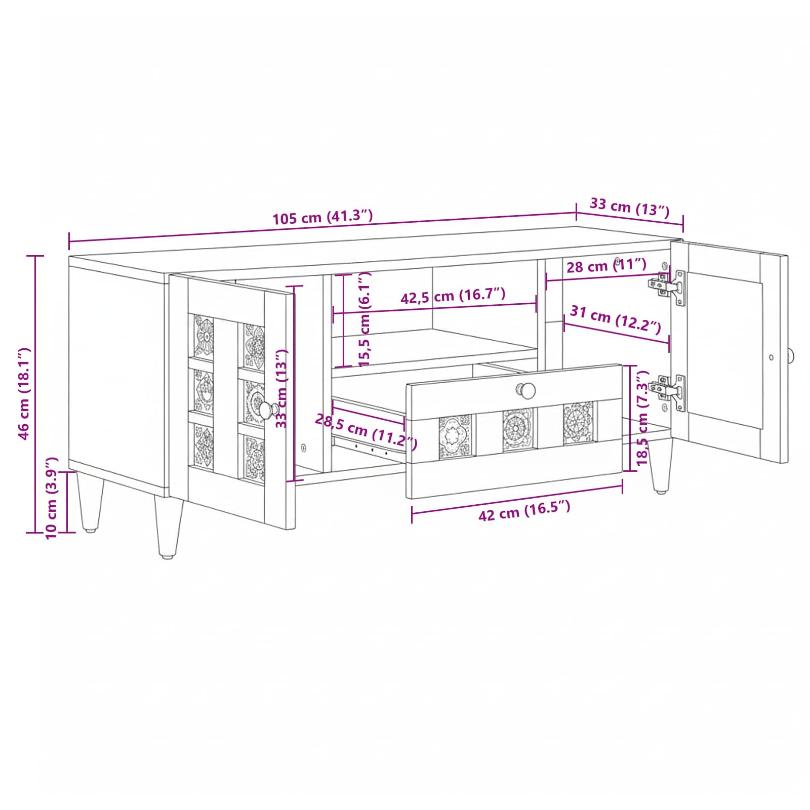 Ta TV omarica odlično združuje moderni stil s praktičnim shranjevanjem. Narejena je iz trdnega mangovega lesa in se ponaša z elegantnim, minimalističnim dizajnom, ki je primeren za sodobne domove. Praktična zasnova omogoča shranjevanje medijskih naprav in dodatkov brez težav. TV omarica se lepo prilega pod vaš televizor in doda čist ter eleganten videz vašemu prostoru. Izvrsten material: Narejena iz trdnega mangovega lesa, ta TV omarica je dolgotrajna in močna. Naravnost in tekstura mangovega lesa prinašata edinstven čar in toplino, ki ju ljubitelji dnevne sobe zagotovo cenijo, medtem ko inženirski les povečuje njeno stabilnost. Obsežno shranjevanje: S pomočjo več predelkov, vrati in gladko delujočimi predali, ta omarica ponuja dovolj prostora za organizacijo in shranjevanje elektronike in medijskih dodatkov. Gumbi na predalih in vratih dodajo eleganten pridih. Moderna zasnova: S minimalističnim pristopom ponuja TV omarica čiste linije in funkcionalnost, kar jo naredi popolno za sodobno dekoracijo. Njena prostorsko učinkovita pravokotna oblika omogoča dovolj površine za dodatne dekorativne stvari. Priporočena uporaba: Zasnovana posebej za dnevne sobe, ta omarica učinkovito shranjuje medijske komponente. Njena vsestranska zasnova dopušča uporabo tako kot stojalo za televizor kot tudi kot shranjevalno omaro za vaš sodoben dom. Podrobnosti o sestavi: Dobavljena kot 1 x TV omarica, potrebuje dva človeka in izvijač za enostavno sestavo. To zagotavlja stabilno namestitev in končni sijaj, primern za notranjo uporabo. Za nego priporočamo redno brisanje prahu in izogibanje ostrim čistilnim kemikalijam.