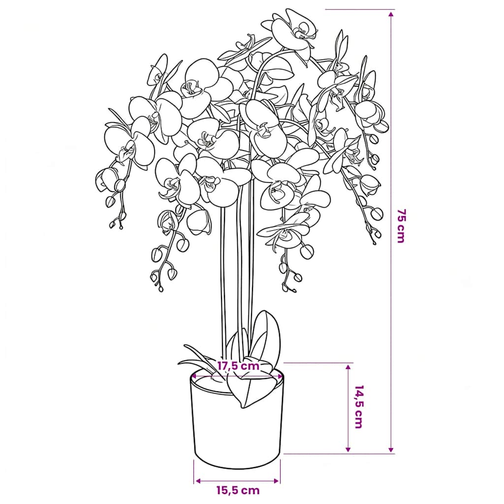S to realistično umetno orhidejo lahko v svoje notranje prostore vnesete nekaj zelenja! Orhideja je visoka 75 cm, zato bo odlična izbira za vaš dom ali pisarno. Rastlina ima 9 listov in 43 cvetov s popolnimi detajli, ki ji dajejo poln, realističen videz in nikoli ne ovenijo. Listi se rahlo razlikujejo v barvi, kar zagotavlja realističen videz in občutek. Ta dekorativna umetna rastlina je zelo trpežna in narejena iz visokokakovostnih materialov. Idealna je za tiste, ki želijo imeti doma rože, vendar nimajo časa za njihovo oskrbo. Paket vsebuje 1 umetno rastlino in 1 lonec.