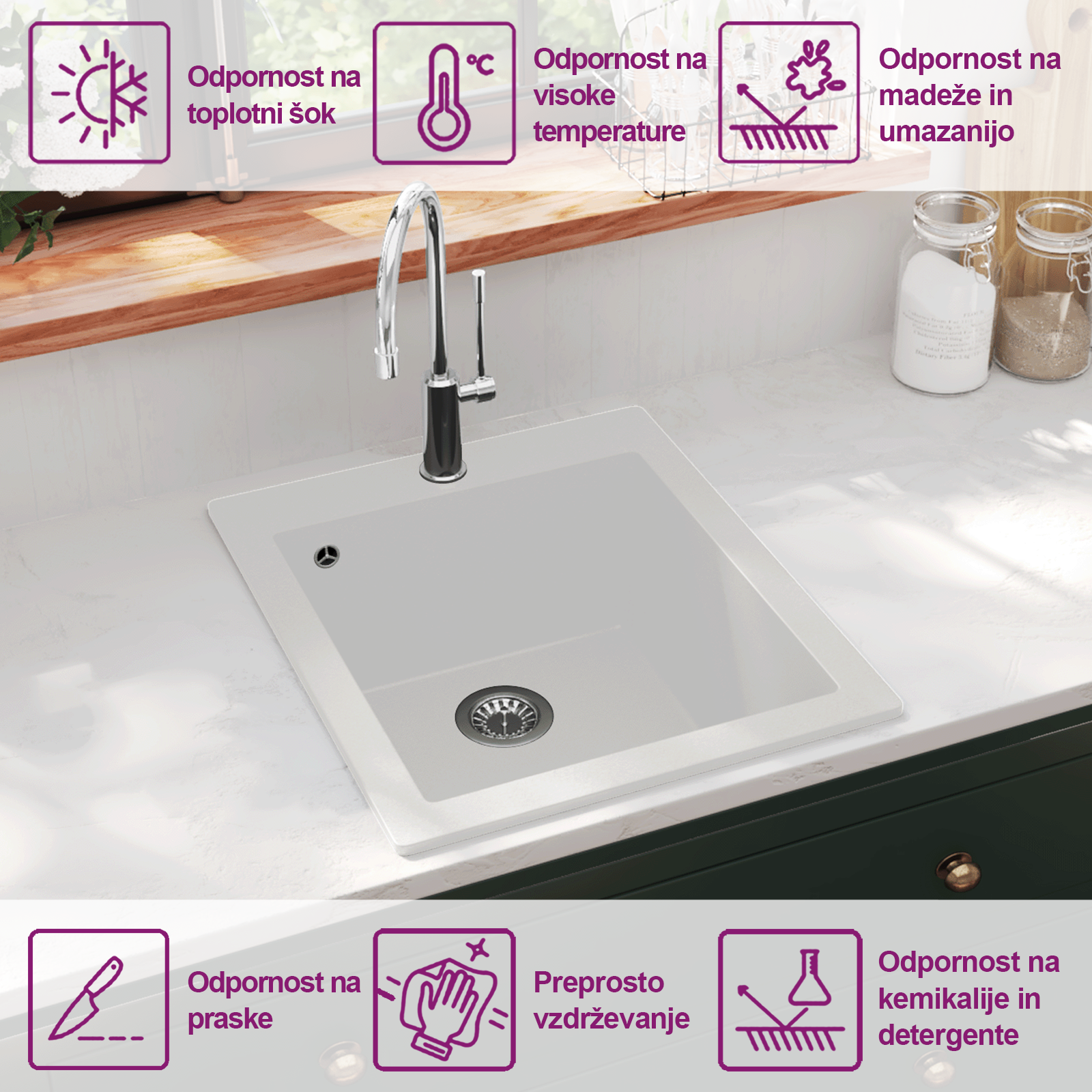 Sodobno kuhinjsko korito z enojim, posebej velikim umivalnikom ima čisto, elegantno obliko in bo vsestranski dodatek k vaši kuhinji. Kuhinjsko korito je odporno na praske in na udarce ter zelo vzdržljivo, saj je narejeno iz zelo kakovostnega granita. Prav tako je odporno na umazanijo in na madeže ter zato preprosto za čiščenje. To pomivalno korito je odporno na toploto do 280 °C. Kuhinjsko korito bo prihranilo prostor, kar vam bo vam bo prineslo več prostora na pultu. Ekstra globoko enojno korito vam nudi dovolj prostora tudi za veliko posodo. Priložen je tudi zamašek izliva za preprosto odstranjevanje odpadkov. Montaža je zelo preprosta.