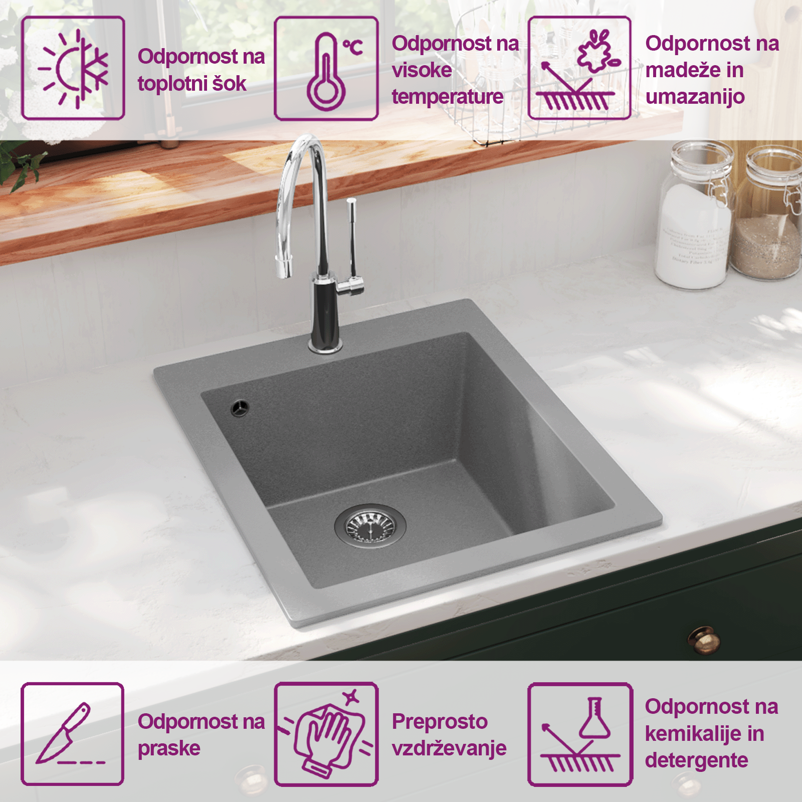 Sodobno kuhinjsko korito z enojim, posebej velikim umivalnikom ima čisto, elegantno obliko in bo vsestranski dodatek k vaši kuhinji. Kuhinjsko korito je odporno na praske in na udarce ter zelo vzdržljivo, saj je narejeno iz zelo kakovostnega granita. Prav tako je odporno na umazanijo in na madeže ter zato preprosto za čiščenje. To pomivalno korito je odporno na toploto do 280 °C. Kuhinjsko korito bo prihranilo prostor, kar vam bo vam bo prineslo več prostora na pultu. Ekstra globoko enojno korito vam nudi dovolj prostora tudi za veliko posodo. Priložen je tudi zamašek izliva za preprosto odstranjevanje odpadkov. Montaža je zelo preprosta.
