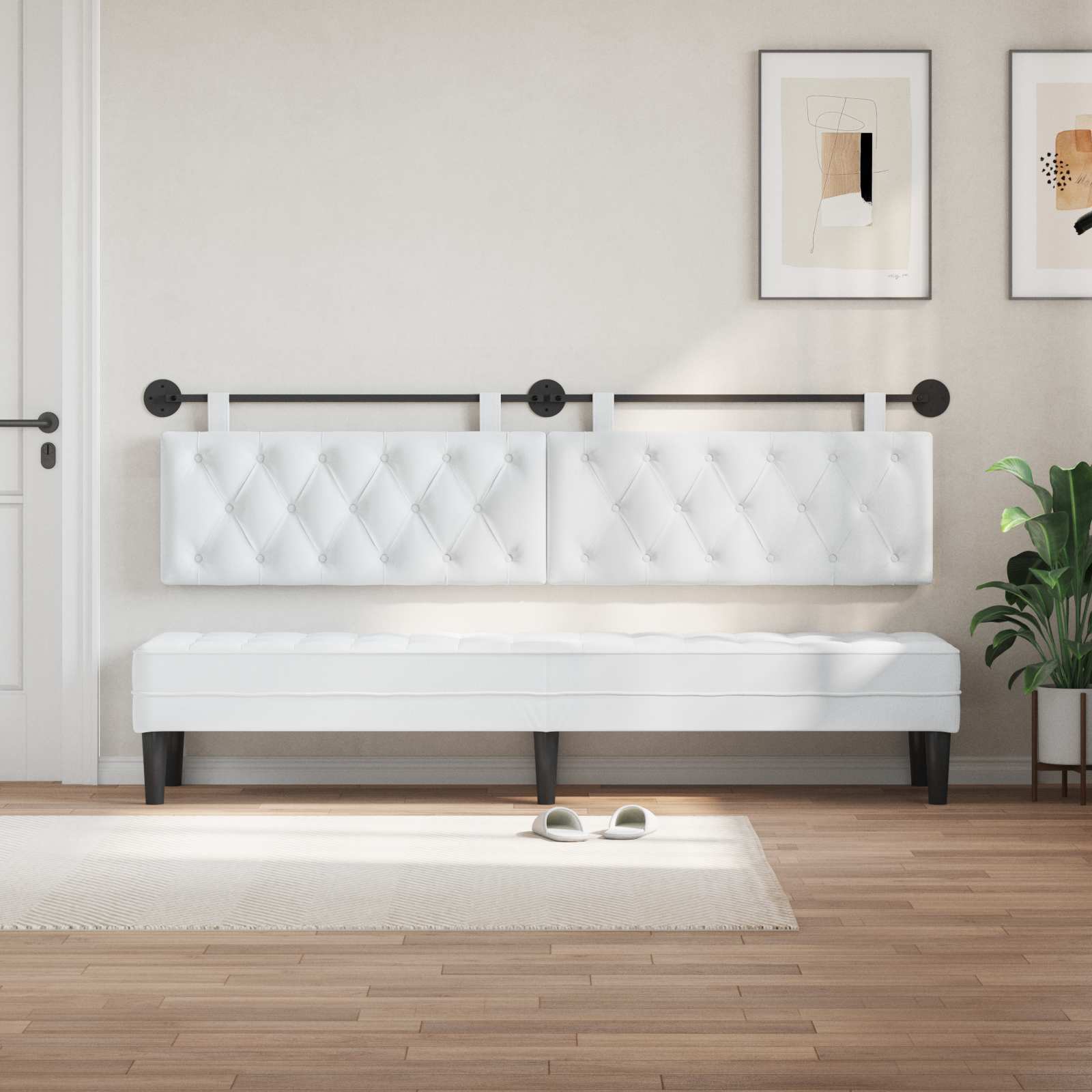 To fleksibilno viseče vzglavje je super tako za funkcionalnost kot za slog. Odlično služi kot vzglavje ali prijetno naslonjalo v različnih prostorih. Sodobna zasnova z belimi linijami in minimalisti dodaja eleganco skoraj povsod. Z dodatkom gumba čutiš razkošje, hkrati pa se brez težav zlije v spalnice, jedilnice ali predsobe. Mehka oblazinjena tkanina naredi vzdušje res prijetno. Kvalitetni materiali: Vzglavje je iz mehke tkanine in pene, ki nudita udobje. Leseni okvir pa doda trdno podporo in večjo vzdržljivost. Kvalitetni materiali zagotavljajo dolgotrajno ugodje in so zanesljiva izbira za vsakodnevno rabo. Priložene komponente: V paketu je prašno premazana kovinska tirnica in dve okrogli kovinski plošči, kar pomeni, da imate vse za namestitev. Dolgi odstranljivi pasovi omogočajo prilagoditev, dodatki za delno sestavljanje pa poenostavijo postopek. Sofisticirana viseča zasnova: Priklop na steno pomaga pri varčevanju s prostorom. S tem se zniža nered na tleh in poveča prostornost, ko pa še vedno ohranja preprost videz. Super je za manjša stanovanja. Večfunkcionalna uporaba: To vzglavje prehaja tradicionalno rabo, odlično je tako za spalnice kot za jedilnice ali predsobe. Izpolnjuje različne potrebe – za sprostitev ali pa za ustvarjanje prijetne atmosfere za goste. Navodila za nego: Zelo enostavno vzdrževanje – samo z brisanjem s suho krpo. Tako ostaja lep in privlačen brez obsežnih čiščenj.