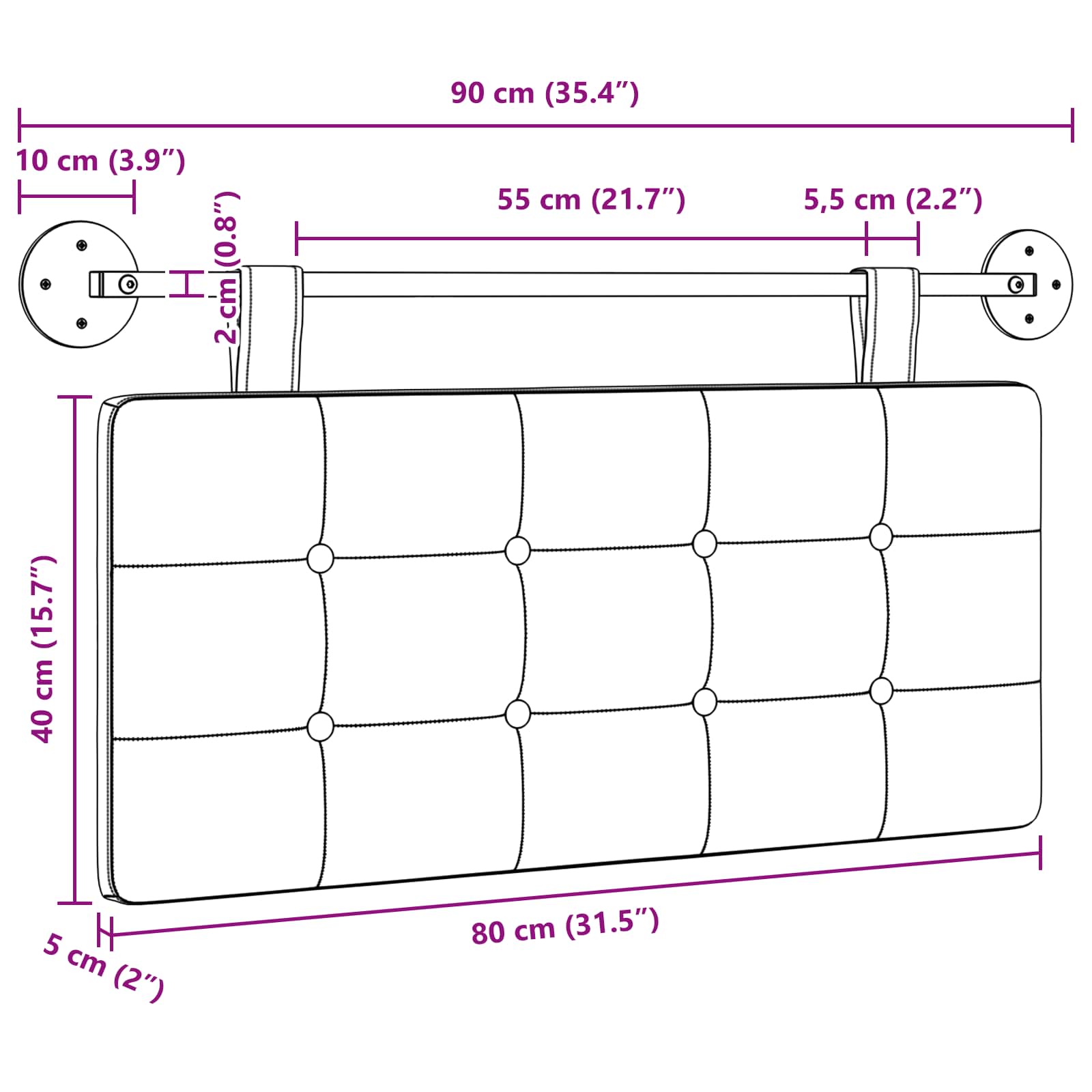 - Velikost plošče vzglavnika: 80 x 40 x 5 cm (š x g x v)
