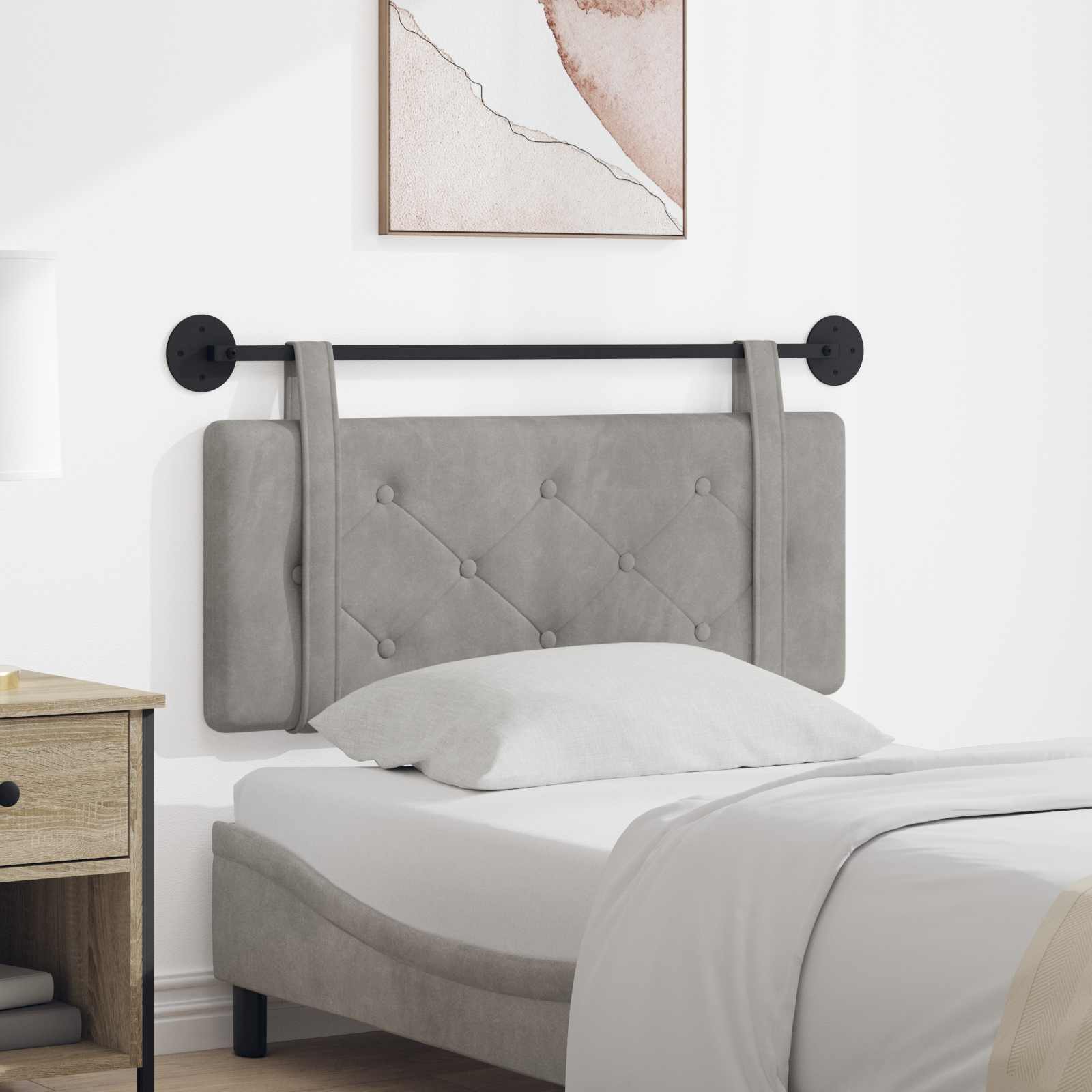 Moderen viseči vzglavnik dvigne vsako spalnico s svojim preprostim dizajnom in funkcionalnostjo. To je idealno za tiste, ki obožujejo estetski videz in prakso. Njegova pravokotna oblika in gumbkovan vzorec ne le, da se skladata s sodobnimi interjeri, ampak tudi ponujata prijetno ozadje za sprostitev. Mehko žametno oblazinjenje Nudi luksuzen občutek z mehkobo, ki je super za branje ali sproščanje. Njegova tekstura doda stil in udobje v vaš prostor. Okvir iz inženirskega lesa Nudi trdno podporo, obdrži pa lahkotnost. Pripravljen je za dolgotrajno uporabo, kar zagotavlja stabilnost vašega posteljnega seta. Gumbkovan vzorec Ta dizajn prinaša stilsko noto in dodatno udobje. Vsak gumb doda kanček elegance, kar vaše spalnice spremeni v prijetno zatočišče. Montaža na steno Zasnovan za stensko montažo, ta vzglavnik prihrani prostor in prinaša eleganten videz. Ponuja stabilnost in organizira vašo spalnico. Enostavno vzdrževanje Kratka navodila za nego. Preprosto ga obrišite s suho krpo, da ga ohranite čist in brez prahu.