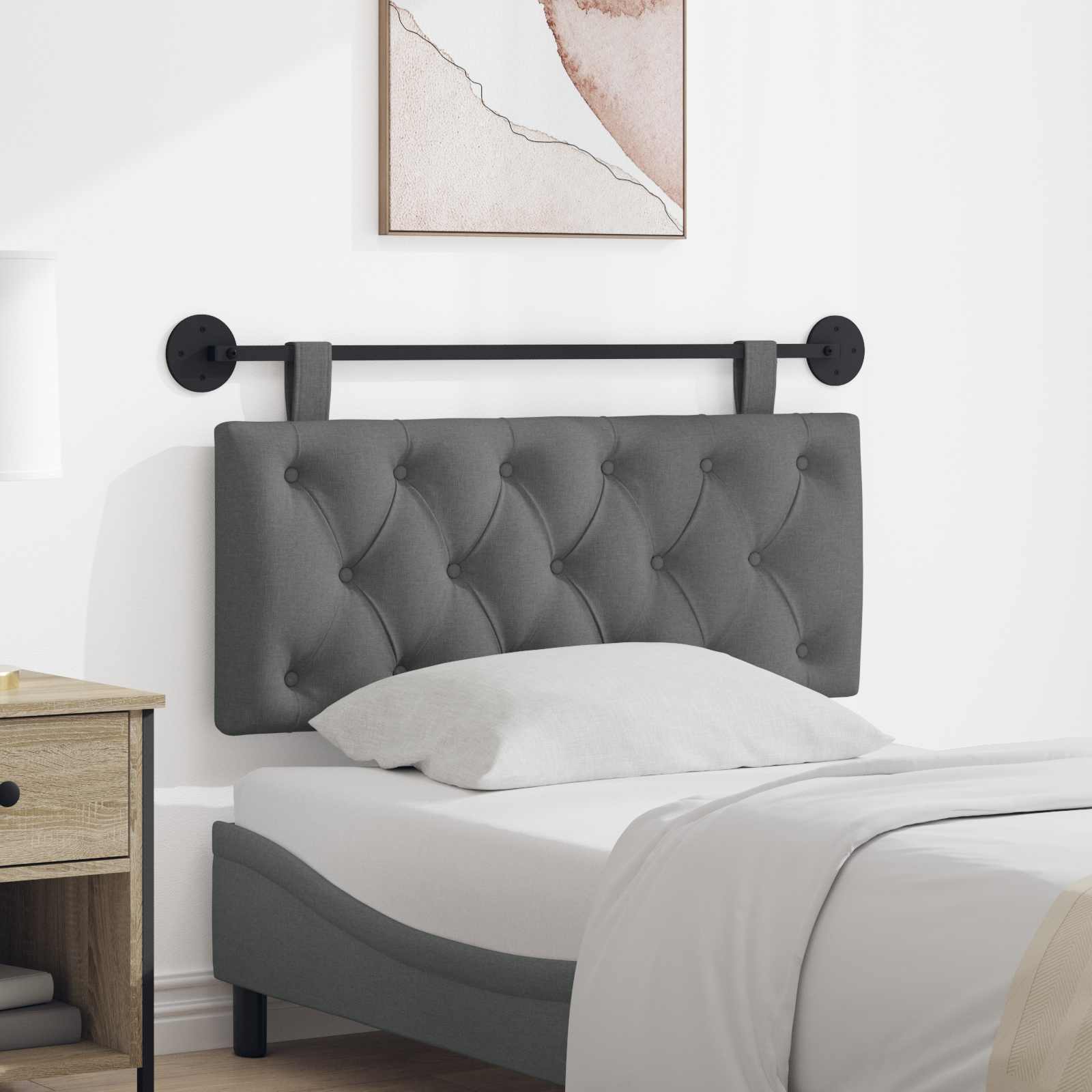 To fleksibilno viseče vzglavje je super tako za funkcionalnost kot za slog. Odlično služi kot vzglavje ali prijetno naslonjalo v različnih prostorih. Sodobna zasnova z belimi linijami in minimalisti dodaja eleganco skoraj povsod. Z dodatkom gumba čutiš razkošje, hkrati pa se brez težav zlije v spalnice, jedilnice ali predsobe. Mehka oblazinjena tkanina naredi vzdušje res prijetno. Kvalitetni materiali: Vzglavje je iz mehke tkanine in pene, ki nudita udobje. Leseni okvir pa doda trdno podporo in večjo vzdržljivost. Kvalitetni materiali zagotavljajo dolgotrajno ugodje in so zanesljiva izbira za vsakodnevno rabo. Priložene komponente: V paketu je prašno premazana kovinska tirnica in dve okrogli kovinski plošči, kar pomeni, da imate vse za namestitev. Dolgi odstranljivi pasovi omogočajo prilagoditev, dodatki za delno sestavljanje pa poenostavijo postopek. Sofisticirana viseča zasnova: Priklop na steno pomaga pri varčevanju s prostorom. S tem se zniža nered na tleh in poveča prostornost, ko pa še vedno ohranja preprost videz. Super je za manjša stanovanja. Večfunkcionalna uporaba: To vzglavje prehaja tradicionalno rabo, odlično je tako za spalnice kot za jedilnice ali predsobe. Izpolnjuje različne potrebe – za sprostitev ali pa za ustvarjanje prijetne atmosfere za goste. Navodila za nego: Zelo enostavno vzdrževanje – samo z brisanjem s suho krpo. Tako ostaja lep in privlačen brez obsežnih čiščenj.