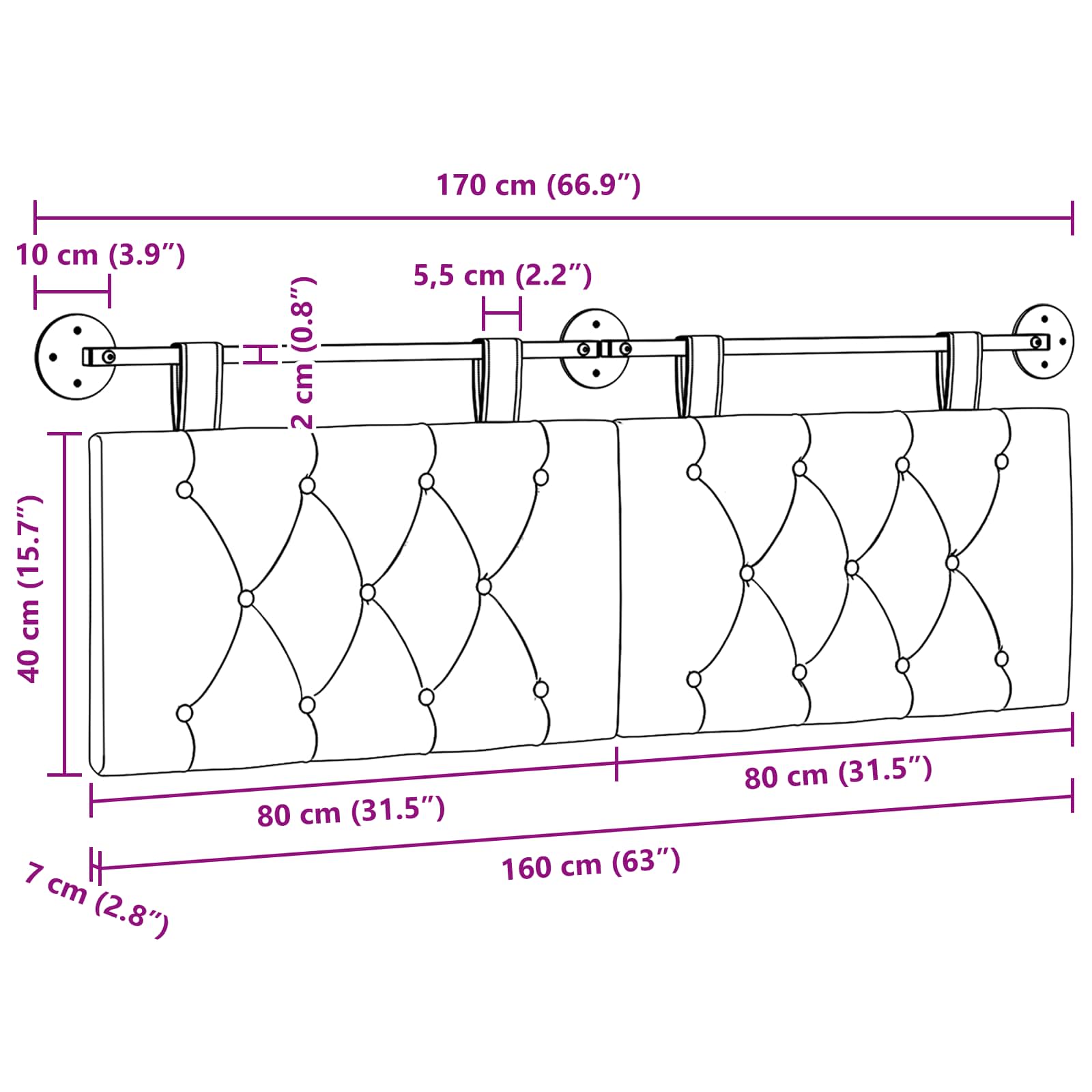 - Velikost plošče vzglavnika: 80 x 40 x 7 cm (š x g x v)