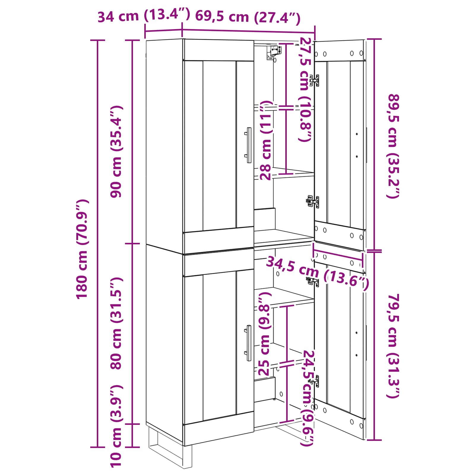 - 1 x Vrh za visok omarico: 69,5 x 34 x 90 cm (D x Š x V)