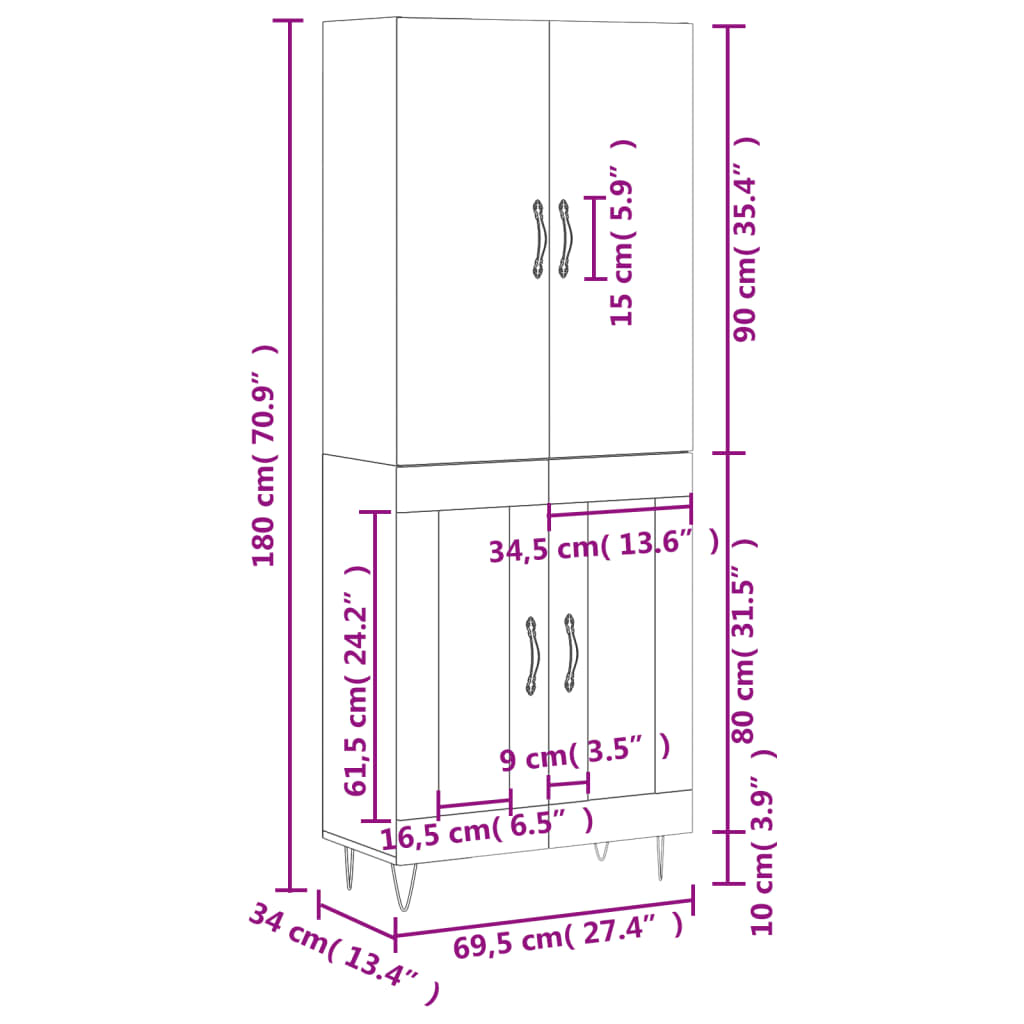 - Mere zgornje plošče: 69,5 x 34 x 90 cm (Š x G x V)