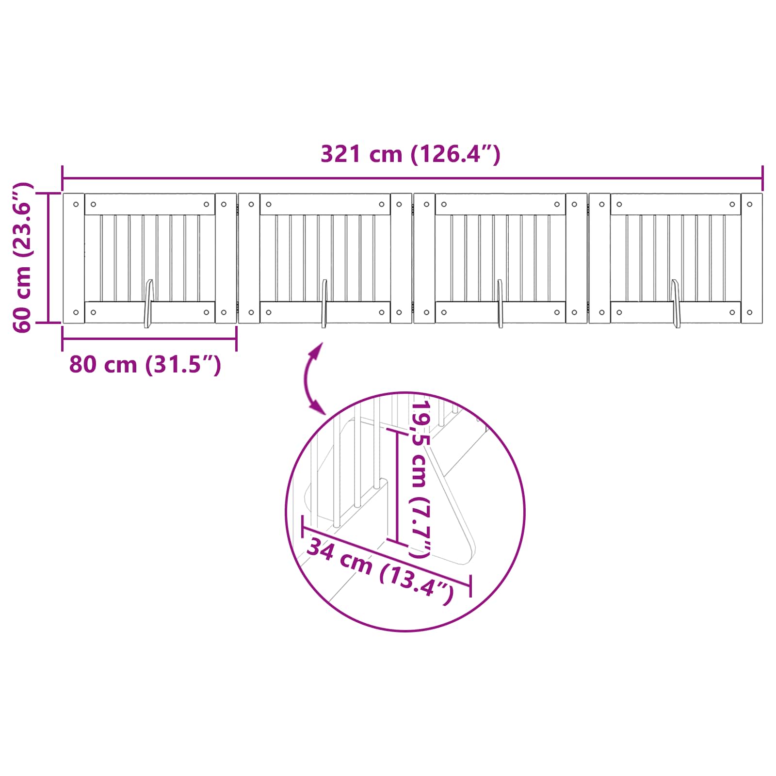 - Splošne dimenzije: 321 x 34 x 60 cm (D x Š x V)