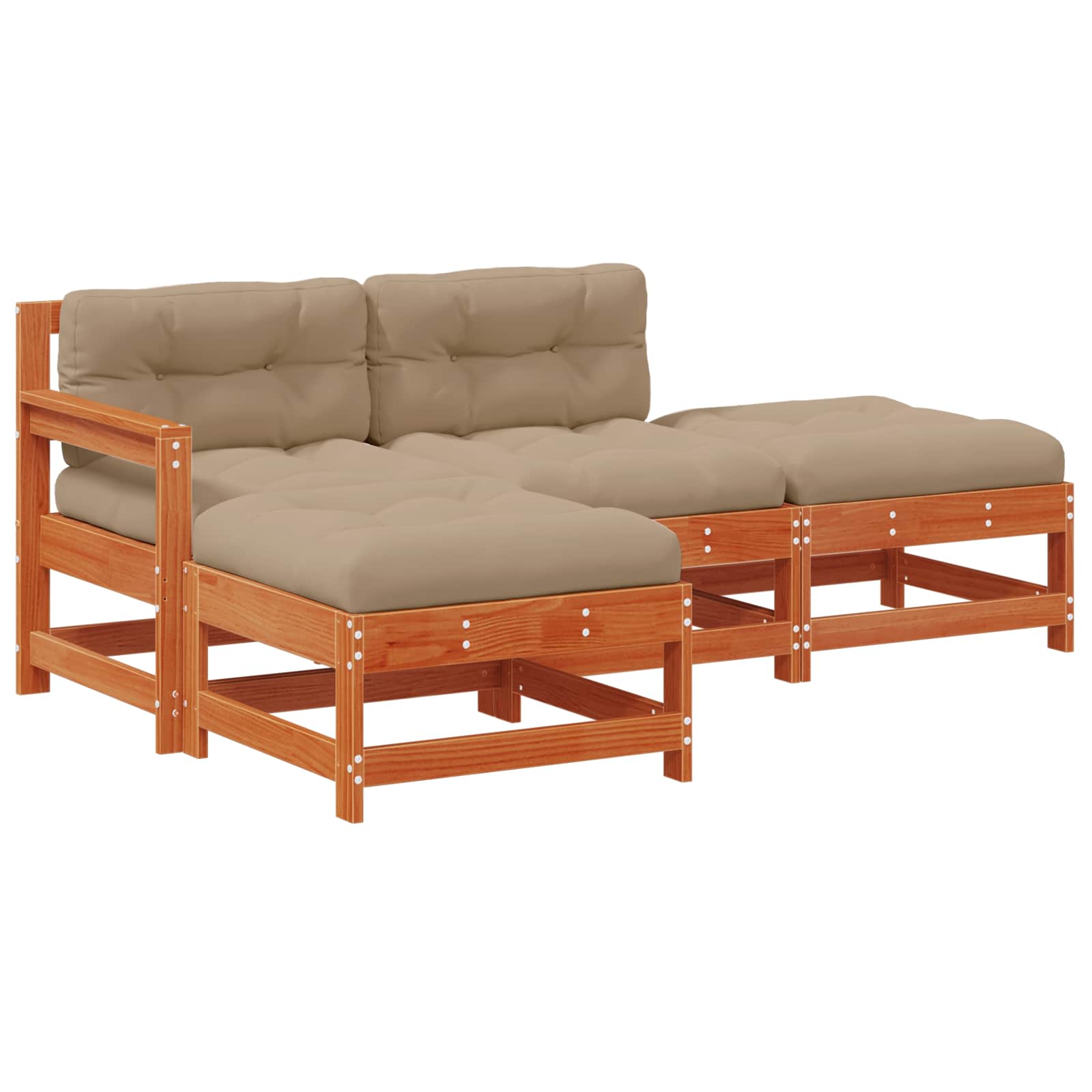 Ta modularni vrtni lounge set je lepo oblikovana garnitura, super za zunanjo uporabo, ki združuje sodoben dizajn z elegantnim pridihom. Z gladkimi teksturami in čistimi linijami ponuja sofisticiran videz, ki obogati vsak vrt ali teraso. Garnitura vključuje vogalni kavč, sredinski kavč, footrest in blazine, kar omogoča različne postavitve, primerne za družabna srečanja ali tiho sprostitev. Ne glede na to, ali imate zabavo na prostem ali se želite sprostiti ob knjigi, ta lounge set nudi udobje in prilagodljivost, obogateno s sodobnim izgledom in občutkom. Trdna borova konstrukcija: Ta lounge set je narejen iz robustnega trdega borovega lesa, kar zagotavlja dolgo življenjsko dobo in stabilnost. Les oddaja topel občutek, ki prinaša naravno lepoto v vsak zunanji prostor. Trdi bor je tudi odporen na različne vremenske vplive, zato je ta set zanesljiva izbira za vrtno pohištvo. Udobje z blazinami: Vsak sedež je opremljen s polipropilenskimi blazinami, ki nudijo dodatno udobje za dolga lenarjenja. Blazine so lahke in odporne na vlago, kar olajša vzdrževanje in zagotavlja dolgotrajno mehkobo. Fleksibilna postavitev: Modularna zasnova, ki vključuje vogalni in sredinski kavč ter footrest, omogoča preureditev sedežne postavitve, kar je super za različne dogodke. Fleksibilnost te garniture jo naredi idealno za intimen večer ali večje zunanje dogodke. Značilnosti odporne na vreme: Set je zasnovan za uživanje na prostem, vključuje elemente, odporne na vreme, ki zaščitijo pred soncem in dežjem. Dodatne prevleke in priporočila za uporabo vodoodpornih materialov podaljšujejo življenjsko dobo in vizualno privlačnost vsakega kosa. Enostavno vzdrževanje: Površine seta so gladke in jih je enostavno vzdrževati. Upoštevajte navodila za nego in uporabite prevleke v slabem vremenu, ter se izogibajte neposredni sončni svetlobi. Prilagodljivi postopki zagotavljajo, da set ostane privlačen del vašega vrta skozi vse letne čase.