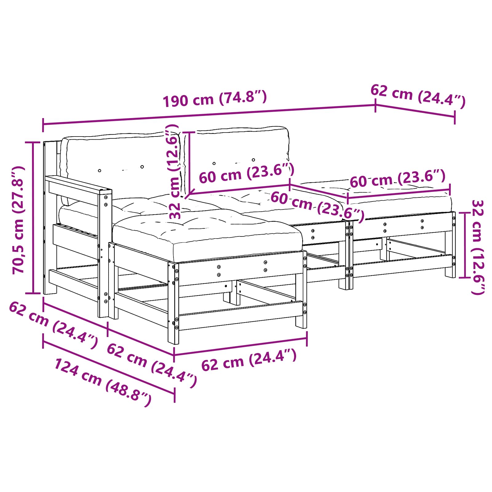 - 4 x sedežna blazina: 60 x 60 x 12 cm (D x Š x V)