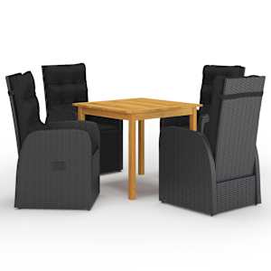 S to vrtno jedilno garnituro lahko ustvarite privlačen in prijeten zunanji prostor! Jedilna miza je narejena iz trdnega akacijevega lesa z oljnim premazom, zato je stabilna, trpežna in enostavna za vzdrževanje. Jedilni stoli imajo jeklen okvir s prašnim premazom, ki je prekrit z vremensko odpornim PE ratanom, zato so stoli trdni in enostavni za čiščenje. Z nastavljivim naslonjalom za hrbet in noge lahko udobno sedite in se resnično sprostite. Naslonjalo za hrbet se prilagaja s potegom stranskega gumba. Zahvaljujoč lahki konstrukciji so stoli precej preprosti za premikanje. Priložene so tudi zelo udobne, debelo podložene blazine, ki zagotavljajo izjemno udobje. Prevleke iz poliestra ne potrebujejo veliko vzdrževanja, poleg tega se jih lahko sname in opere. Pomembna opomba: Če želite, da vam bo jedilna garnitura služila še dolgo, priporočamo, da jo v primeru dežja, snega ali zmrzali pokrijete.