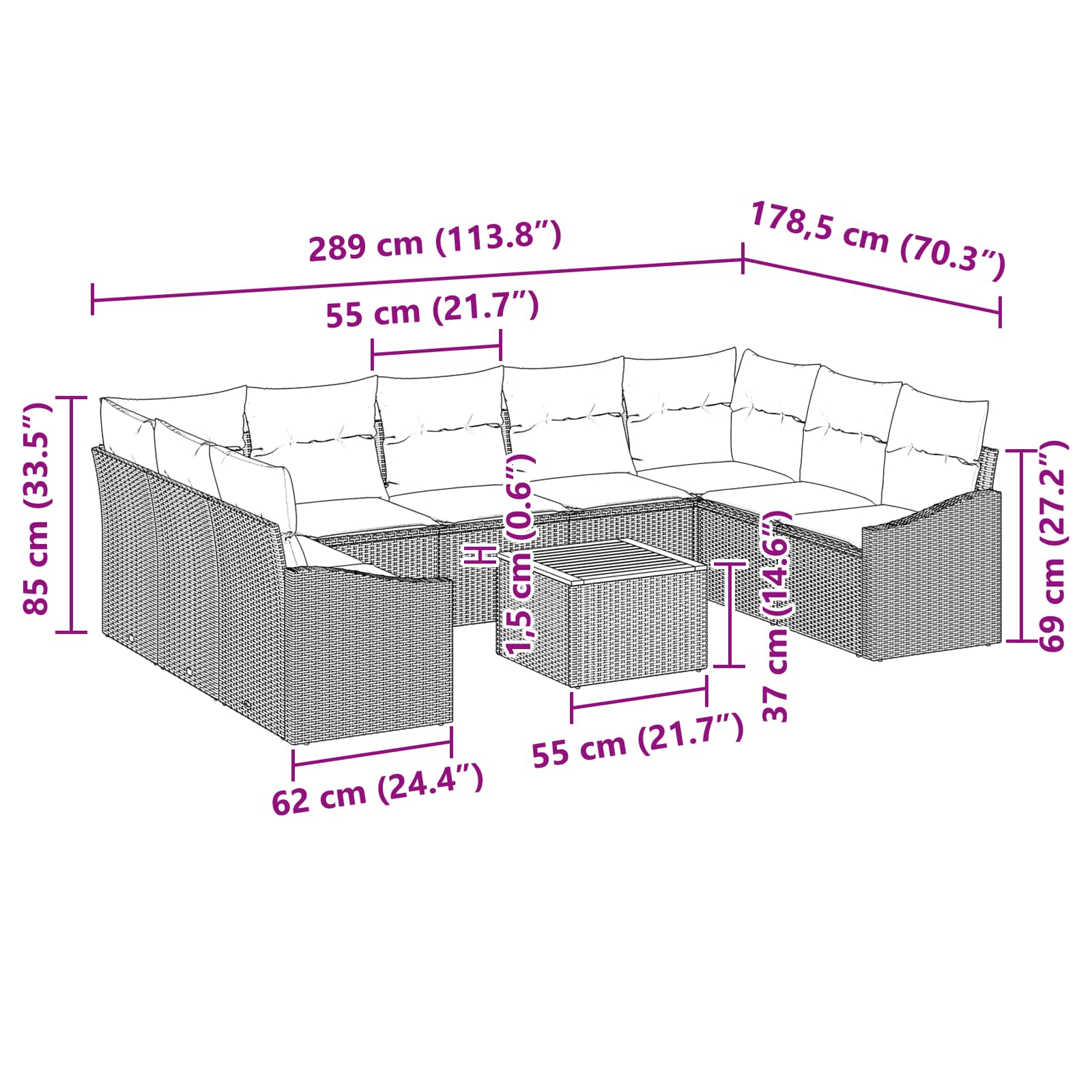 - 2 x Kotni sedež: 62 x 62 x 69 cm (D x Š x V)