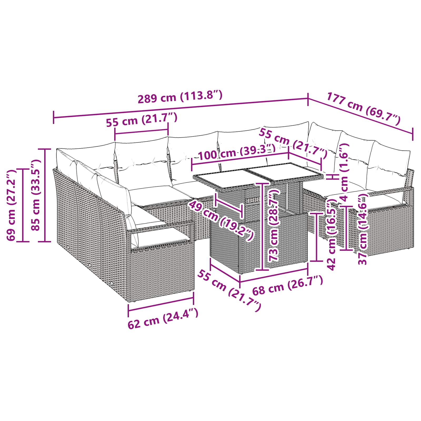 Ta modularna sedežna garnitura za vrt lepo združuje sodoben slog in praktičnost, kar jo naredi super dodatak za vaš vrt ali teraso. S čistimi linijami in minimalističnim dizajnom ta garnitura služi kot vsestranska rešitev za sedenje, bodisi za zabavo bodisi za sprostitev. Premium poli ratan: Sedežna garnitura je narejena iz kakovostnega poli ratana, ki zagotavlja moderen videz in trpežnost proti vremenskim vplivom. UV odpor pa podaljša življenjsko dobo in ohranja videz tudi na soncu. Vključeni komponenti: Opremljena je z različnimi komponentami, kot so dodelan hrbtni del in poli ratan nasloni za roke, kar zagotavlja maksimum udobja. Robustna konstrukcija pa je prašno prelakirana za estetski zaključek, ki povečuje privlačnost. Sodoben, prilagodljiv dizajn: Modularna zasnova omogoča prilagoditev postavitve, kar se lahko prilagodi prostoru, kar poskrbi, da se lepo prilega vsakemu sodobnemu zunanjemu slogu, bodisi za druženja bodisi za sproščanje. Vsestrana uporaba: Ta garnitura je idealna za zunanji prostor, kot so vrtovi, terase ali patio. Opravi različne funkcije, bodisi zabavne s prijatelji ali prijetne trenutke osame v poletnem dnevu. Učinkovito vzdrževanje: Enostavno vzdrževanje vključuje pokrivanje, kadar ni v uporabi, da zaščitite pred vremenskimi vplivi. Prenos blazin v notranje prostore v slabem vremenu tudi podaljša njihovo življenjsko dobo.